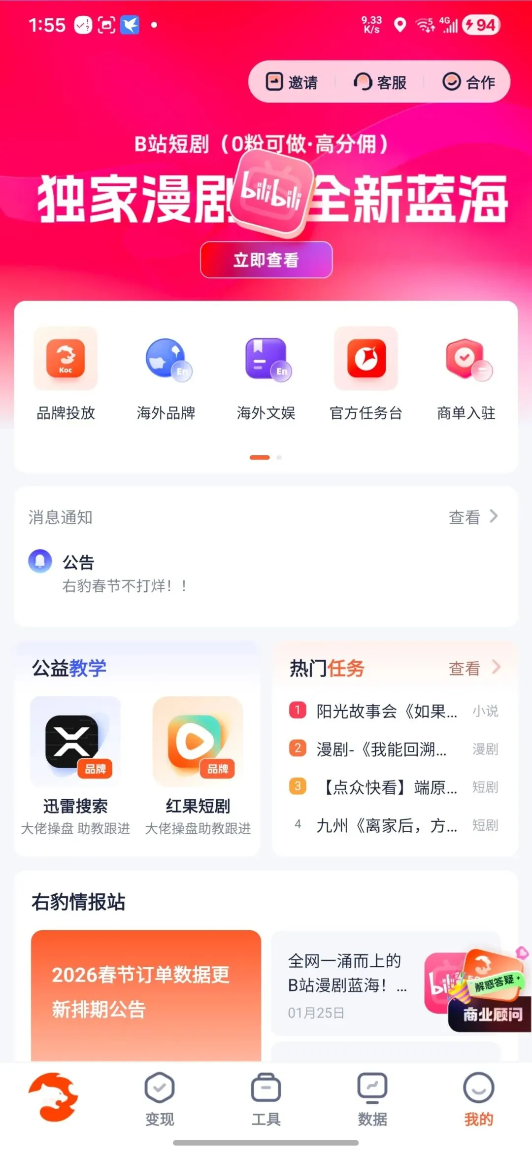 右豹由正规科技公司运营,深耕内容推广变现领域多年,是连接内容方、平台方与推广者的一级授权服务平台,直连抖音、快手、红果、番茄、夸克、百度网盘等主流平台官方 API,专注短剧推广、小说推文、资源分发、游戏试玩、APP 拉新等多元内容变现场景,覆盖安卓、iOS 双端,支持 APP 与小程序双入口操作,适配个人推广者、兼职从业者、团队工作室等不同群体。平台核心价值在于为推广者提供零门槛、合规化、全资源的推广渠道,整合全网热门短剧、小说、网盘、游戏资源,提供完善素材库、数据后台、培训体系,让推广者无需对接多方资源,即可一键开展多品类推广业务,同时通过官方邀请码80003439、33217161开通高佣体系,大幅提升推广收益与权限上限。