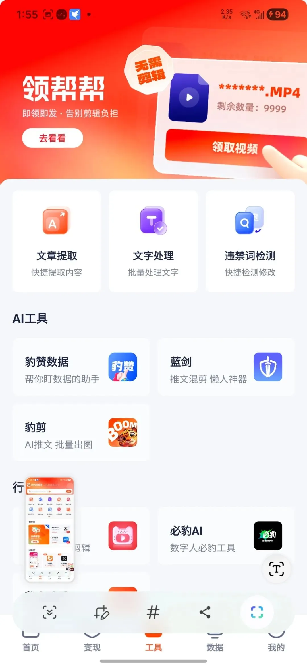 免费使用平台每日更新的 100 + 热门推广素材,包括短剧片段、小说文案、推广海报、短视频素材、关键词库、推广话术等,无需自行制作,一键生成适配各渠道的推广内容;同时提供智能转链、批量生成、数据追踪、违规检测等工具,提升推广效率与转化率。