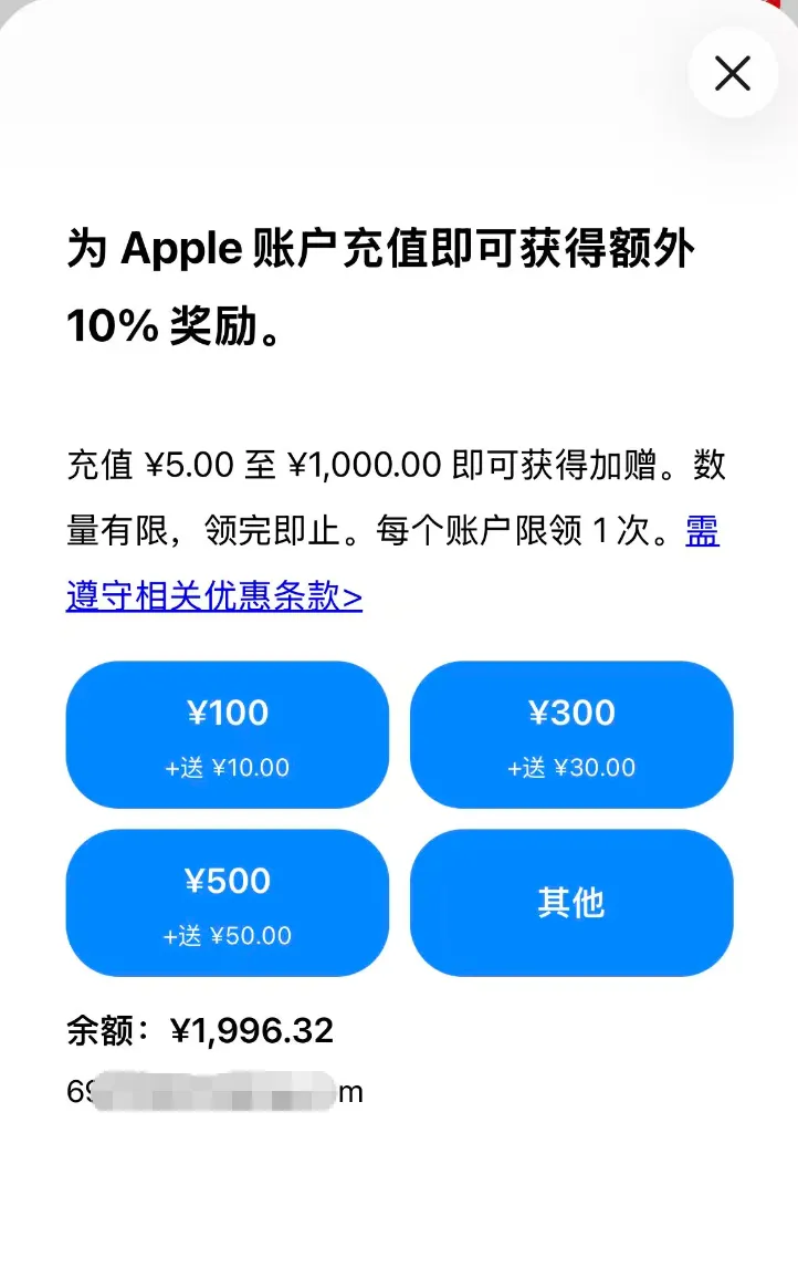 苹果官方上线App Store充值优惠,加赠10%.突发,苹果国区今日忽然上线新活动,充值加赠10%。规则如下:充值¥5.00至¥1,000.00即可获得加赠。数量有限,领完即止。每个账户限领1次。有需要的抓紧,因为数量有限,小编充了300元送了30元。注意需要要在Apple stroe官方充值。