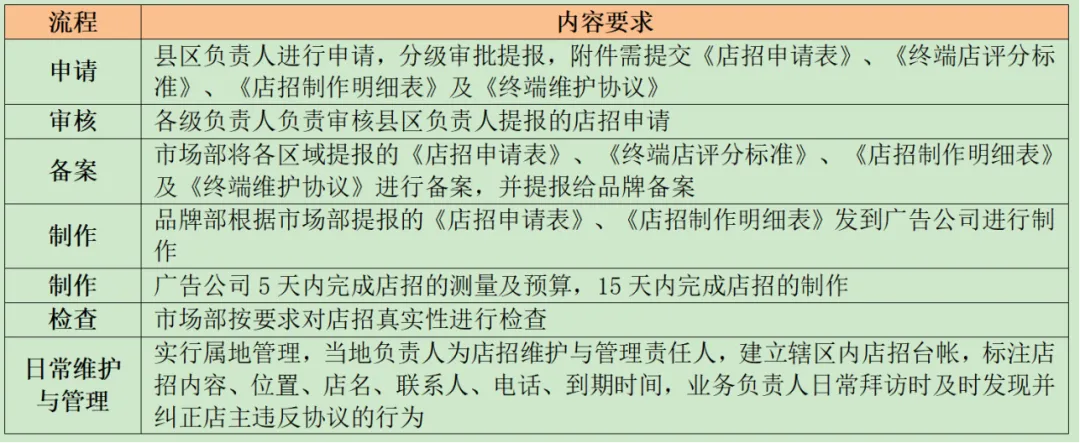 4、品牌部:负责发布店招制作标准,广告公司招标,发送店招制作订单。