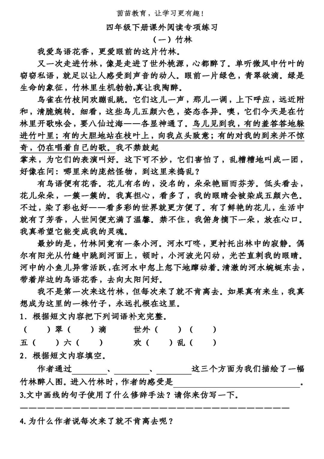 4.因为竹林像个世外桃源,有着醉人的美景:欢蹦乱跳的鸟雀、五颜六色的花朵、蜿蜒流淌的小河,这一切都让作者留恋不肯离去。