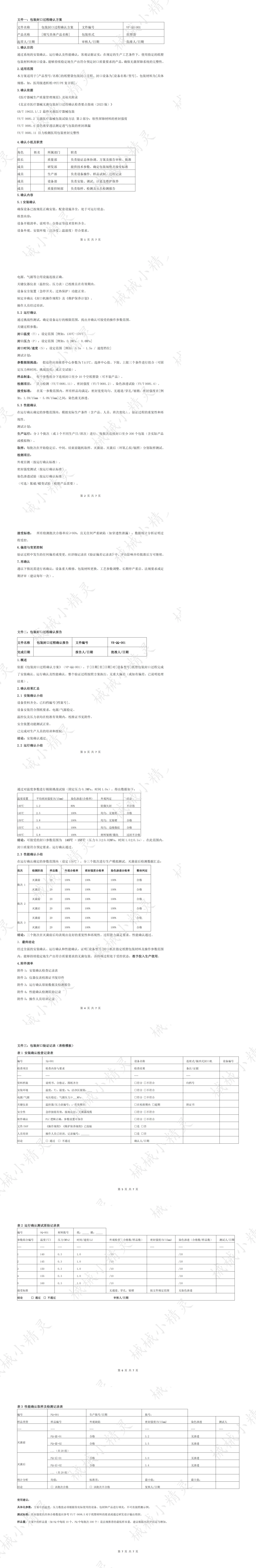 1.确认目的通过系统的安装确认、运行确认及性能确认,客观证据证实:在规定的生产工艺条件下,使用指定的纸塑包装材料和封口设备,能够持续稳定地生产出符合预定封口质量要求的产品,确保无菌屏障系统的完整性。