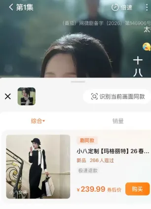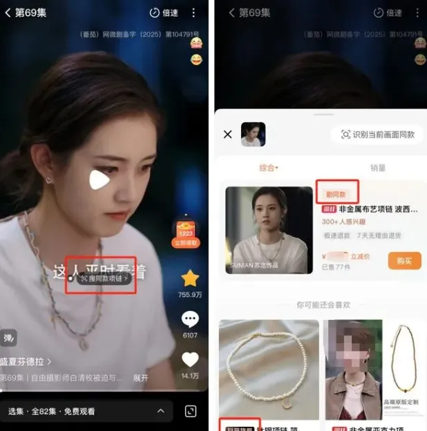 这是目前红果最常用的玩法,也是用户感知最强的。观剧时,不管是主动暂停,还是系统自动弹窗,只要画面里有可识别的商品(服饰、美妆、首饰、家居、食品等),都会弹出“同款”链接,点击就能进入商品详情页,下单流程和在抖音购物完全一样,售后也由抖音电商负责。