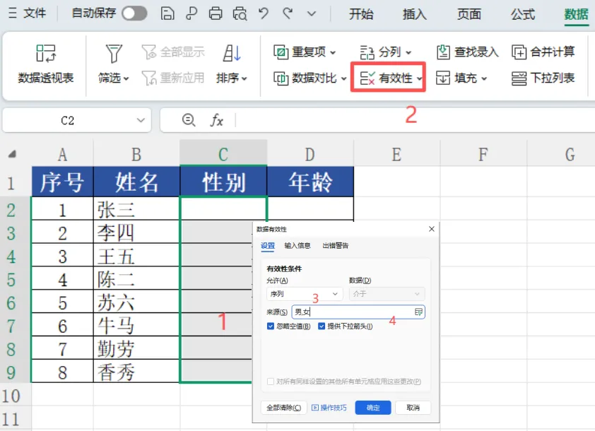 【选中单元格 → 数据 → 有效性 → 把有效性条件改为序列 → 来源中输入选项 “男” “女” 中间用英文逗号隔开】