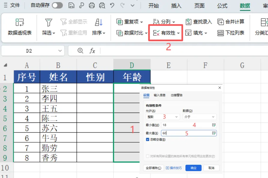 【选中单元格 → 数据 → 数据有效性 → 把允许条件改为整数 → 最小值18,最大值60】