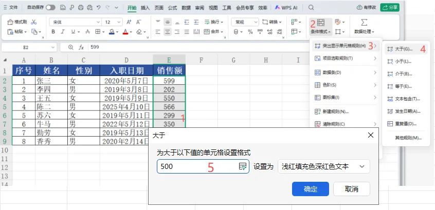 【选中单元格 → 条件格式 → 突出显示单元格规则 → 大于 → 大于500浅红色填充】