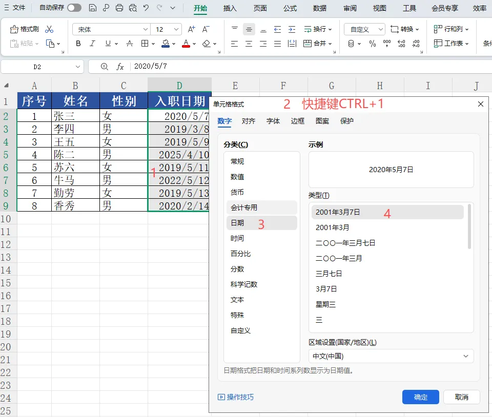 【选中单元格 → 按Ctrl+1 → 点击日期 → 选择需要的样式】