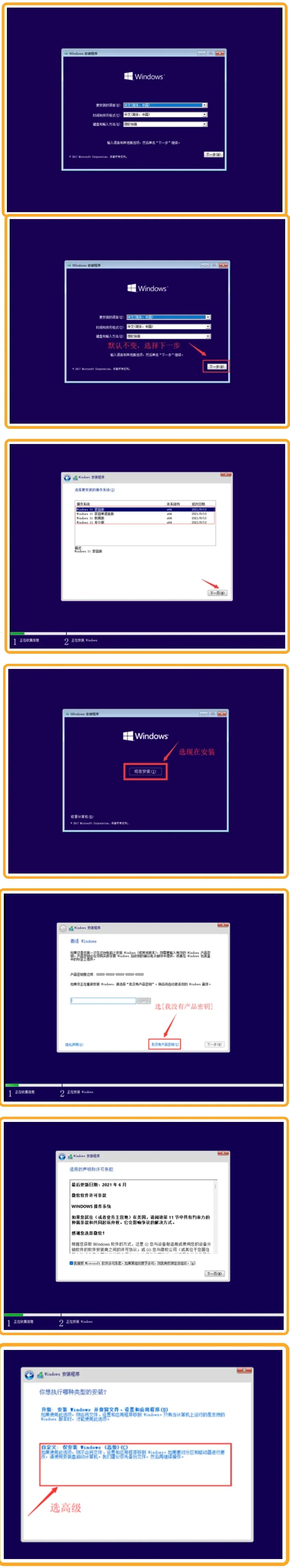 二、安装系统过程(输入密钥步骤跳过即可,系统版本选择Win11家庭单语言版安装,若是机器预装Win11一般联网自动激活,如果没有自动激活,可以在激活选项卡内点击疑难解答按钮,安装错误的系统版本可能导致无法激活)