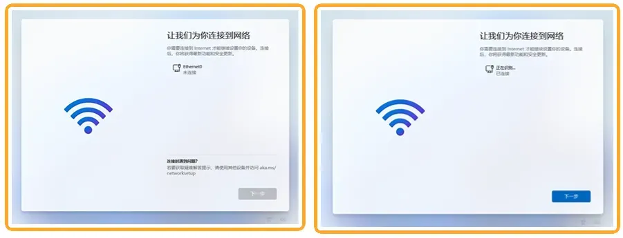 二、进行网络设置,Windows11要求必须要连接网络才可以进行下一步,专业版以上版本支持跳过联网,使用本地账户登录