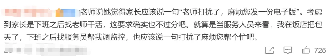 老师对家长的表达方式提出了质疑,认为“让您发个电子版”这一说法不够礼貌,甚至带有一定的指令意味,并进一步延伸到“是否把老师当作服务人员”的问题。