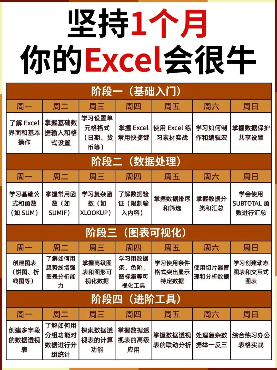 按照这份学习计划,坚持一个月,你的Excel水平一定会有质的飞跃。建议收藏本文,按照阶段逐步学习。