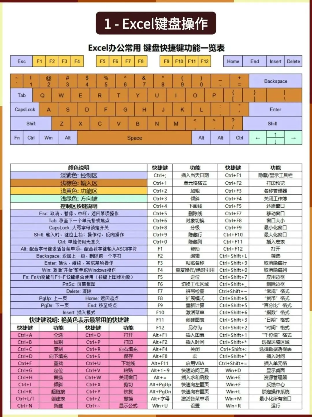 Excel办公常用键盘快捷键功能一览表,掌握这些快捷键能让你的操作效率翻倍。淡紫色区域是控制区,浅棕色是输入区,浅黄色是功能区,浅绿色是方向键。