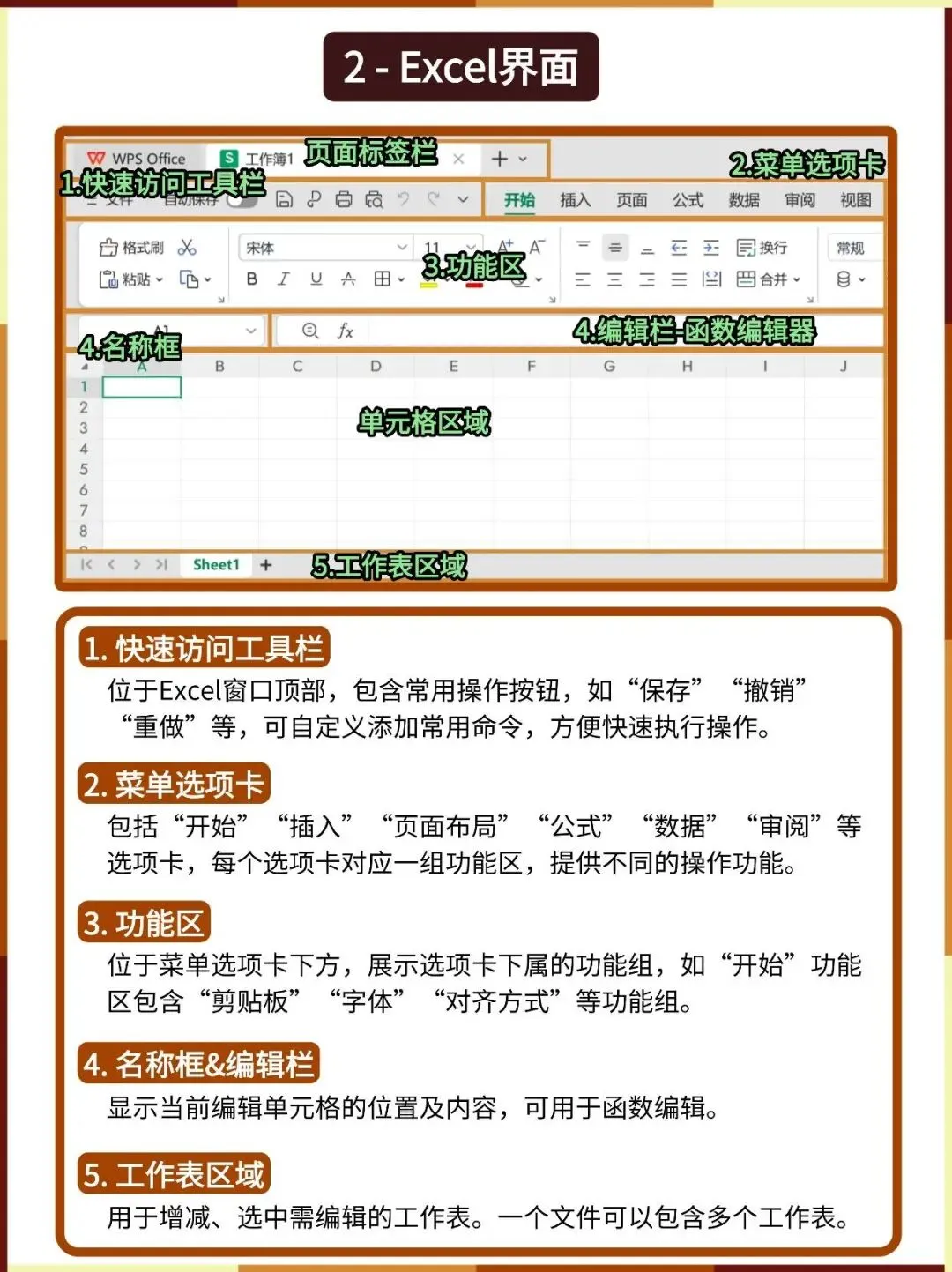 名称框和编辑栏显示当前编辑单元格的位置及内容,可用于函数编辑。工作表区域用于增减、选中需编辑的工作表,一个文件可以包含多个工作表。