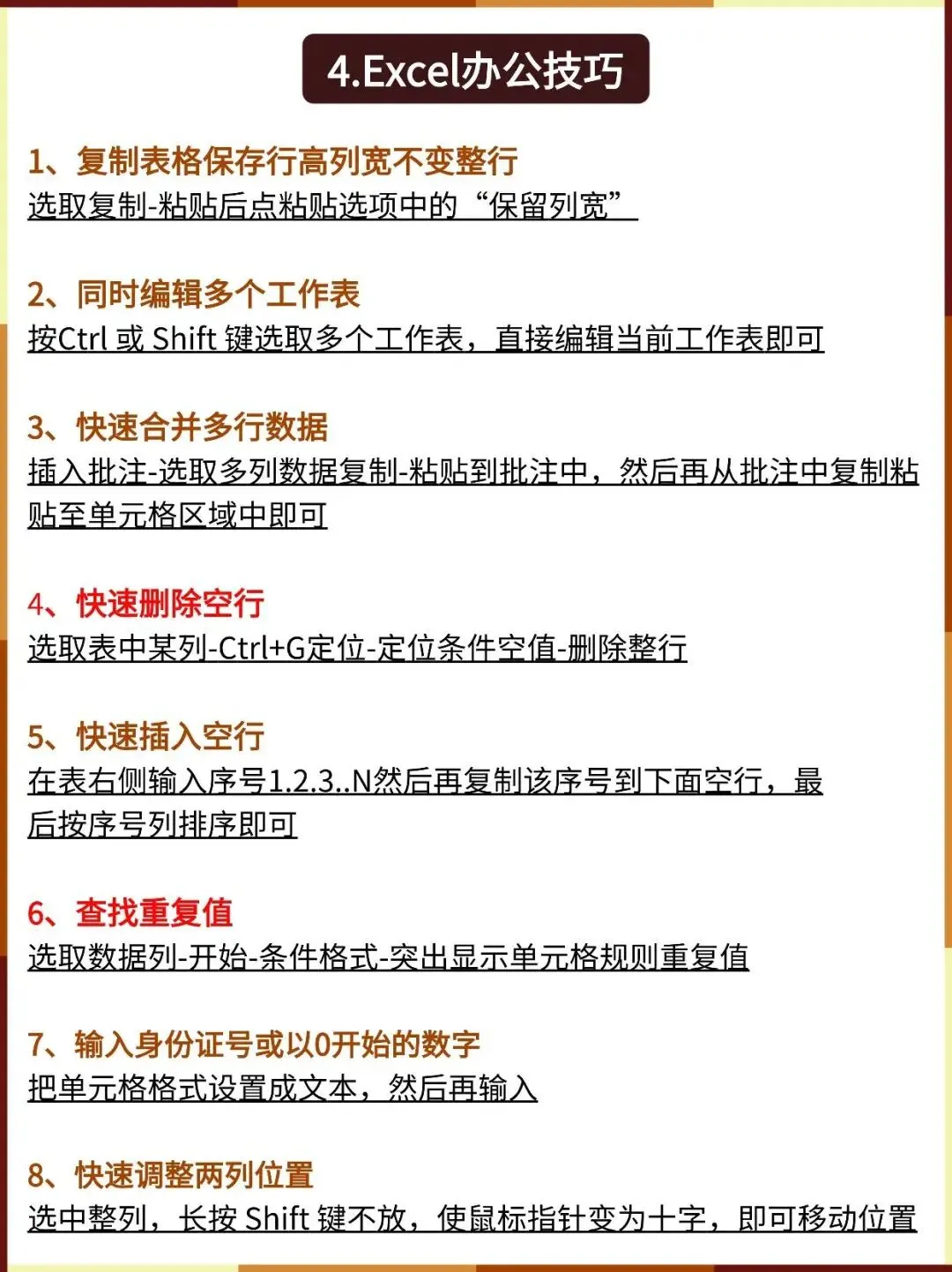 快速插入空行:在表右侧输入序号1.2.3..N然后再复制该序号到下面空行,最后按序号列排序即可。查找重复值:选取数据列-开始-条件格式-突出显示单元格规则重复值。