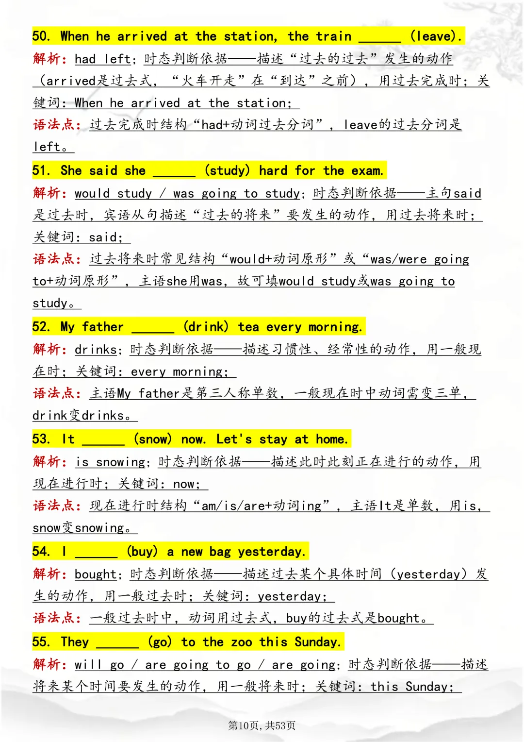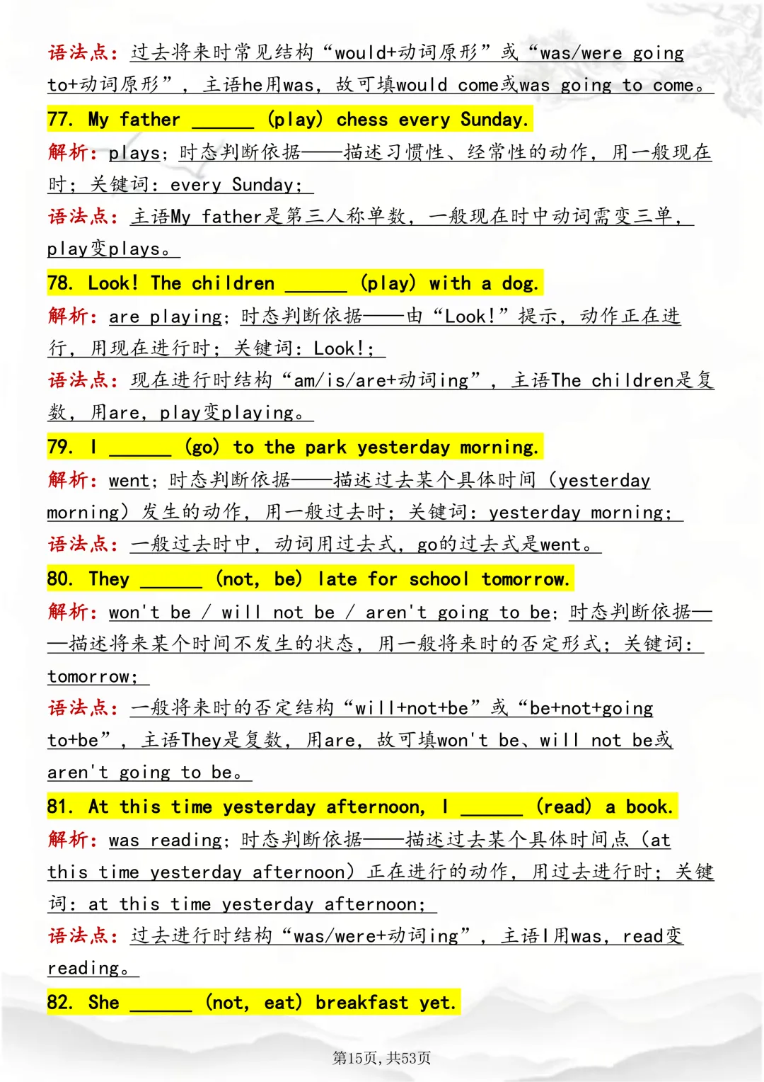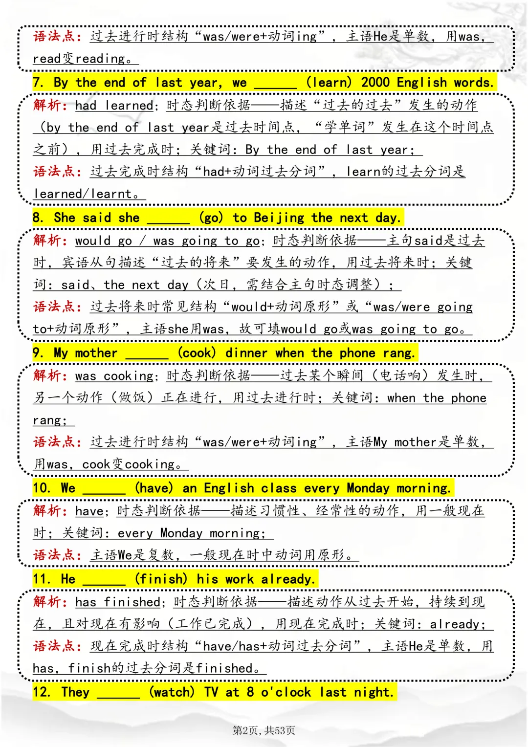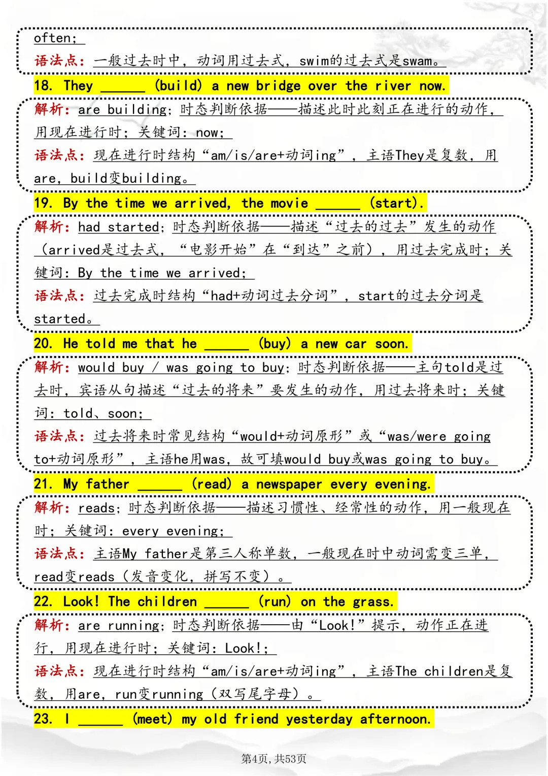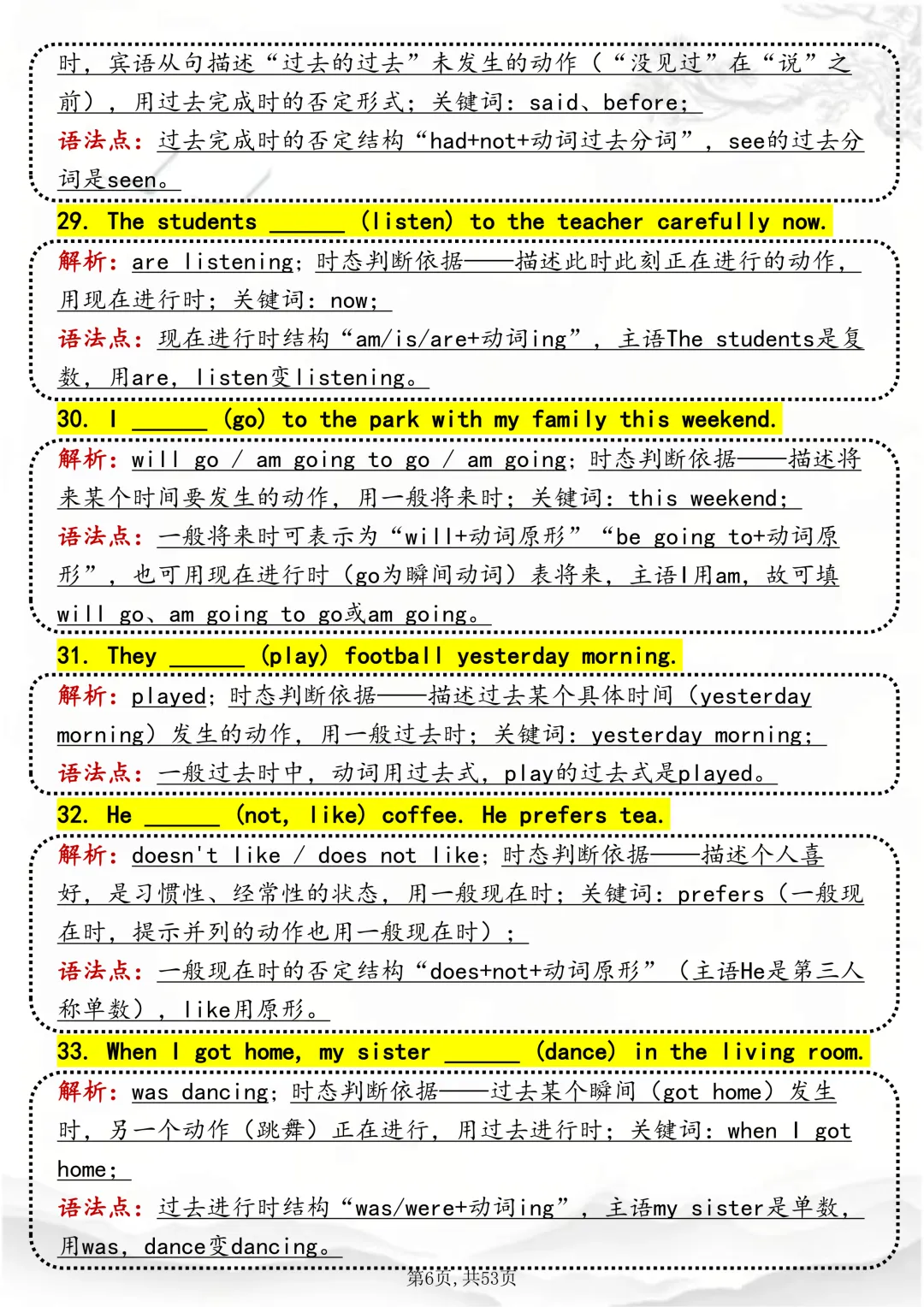 可打印,吃透英语“动词时态“,就靠这篇这篇文章啦!因篇幅有限,点击我的头像私信我回复“资料获取” 就可以领取 word 电子版。以下是部分资料内容,完整高清版的发送私信即可。本篇文章一共 53 页,完整版可打印↓↓↓