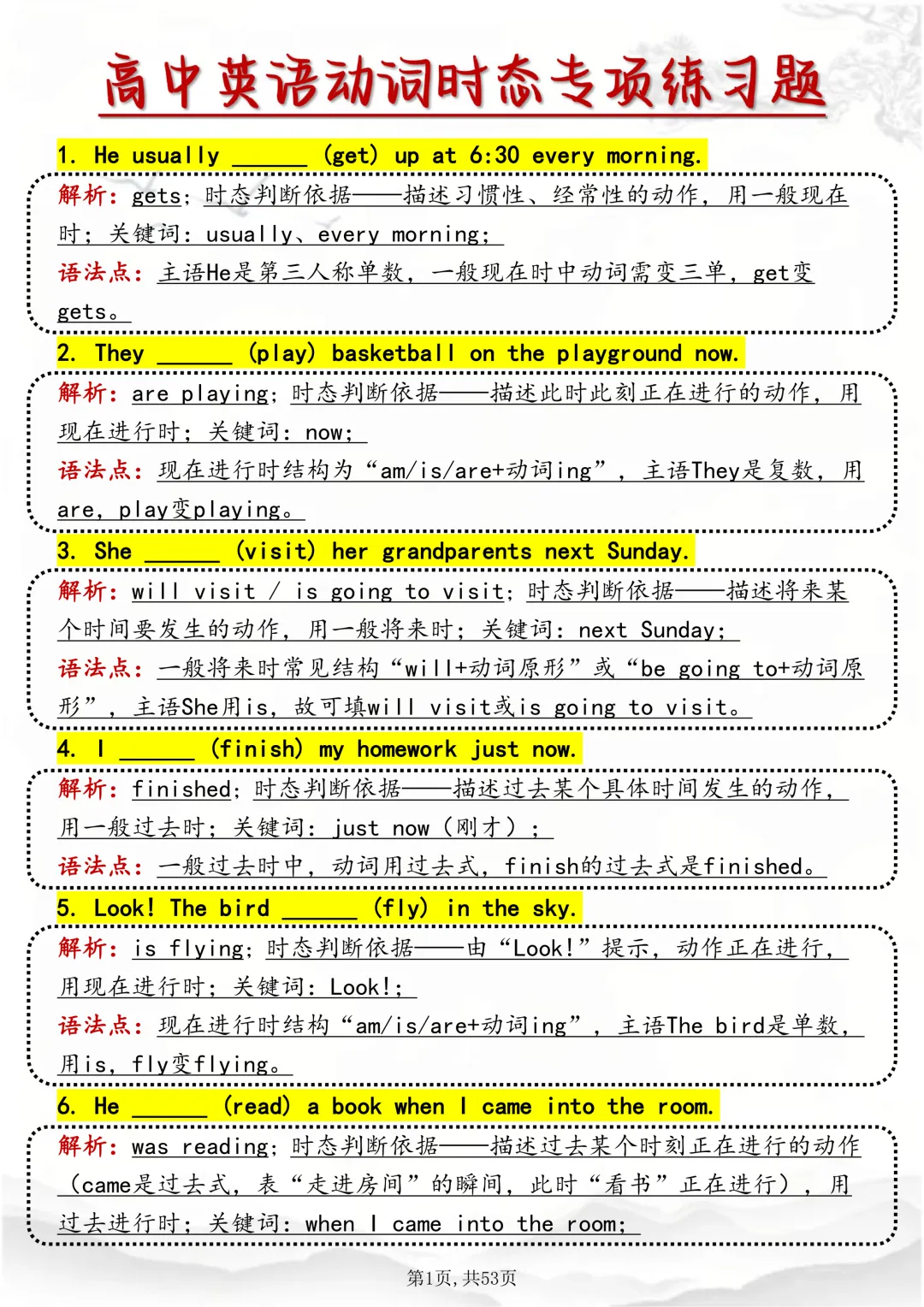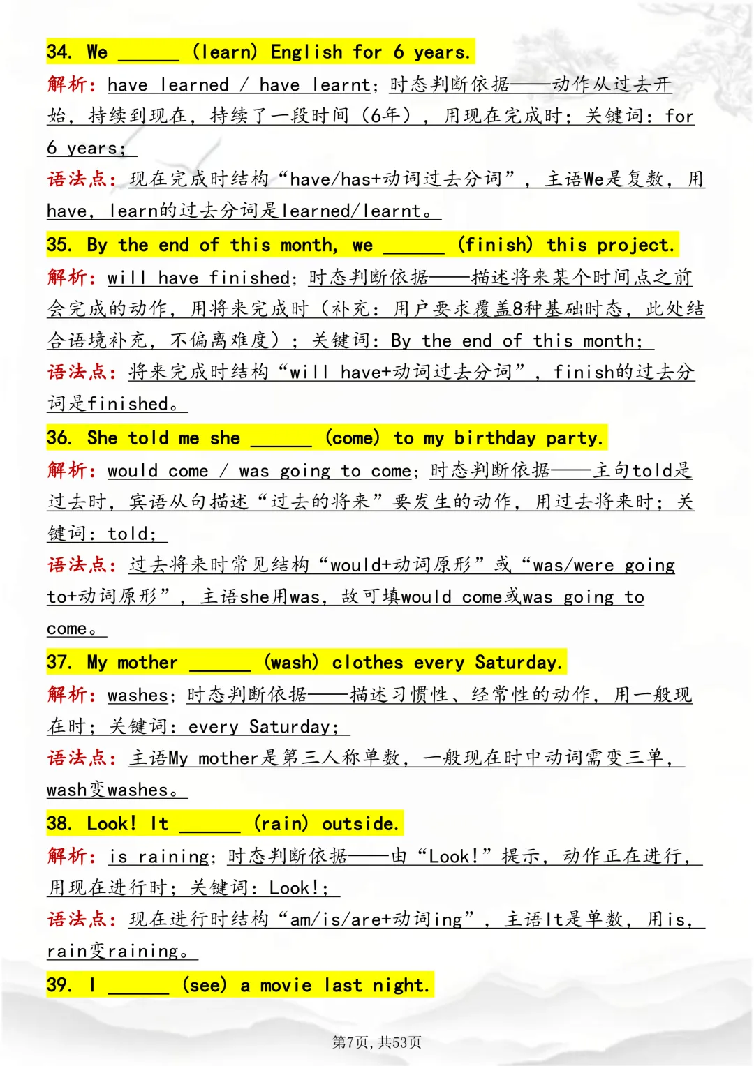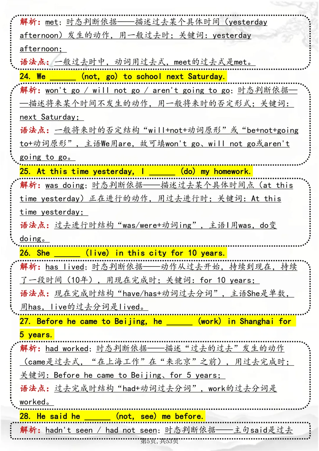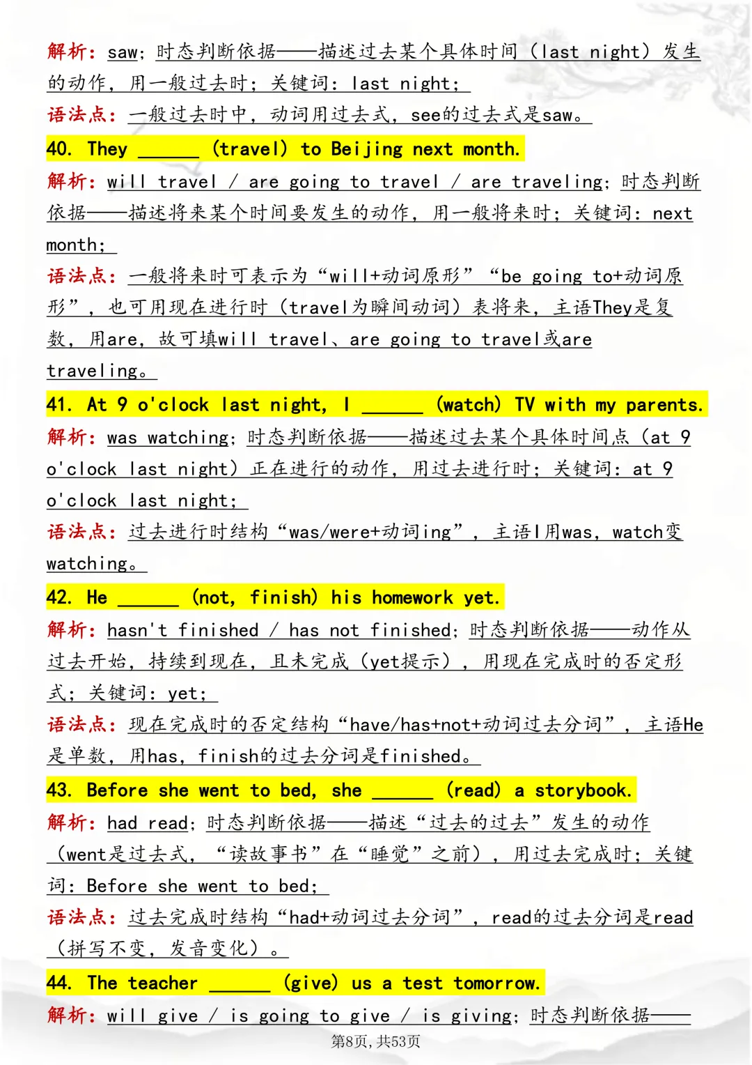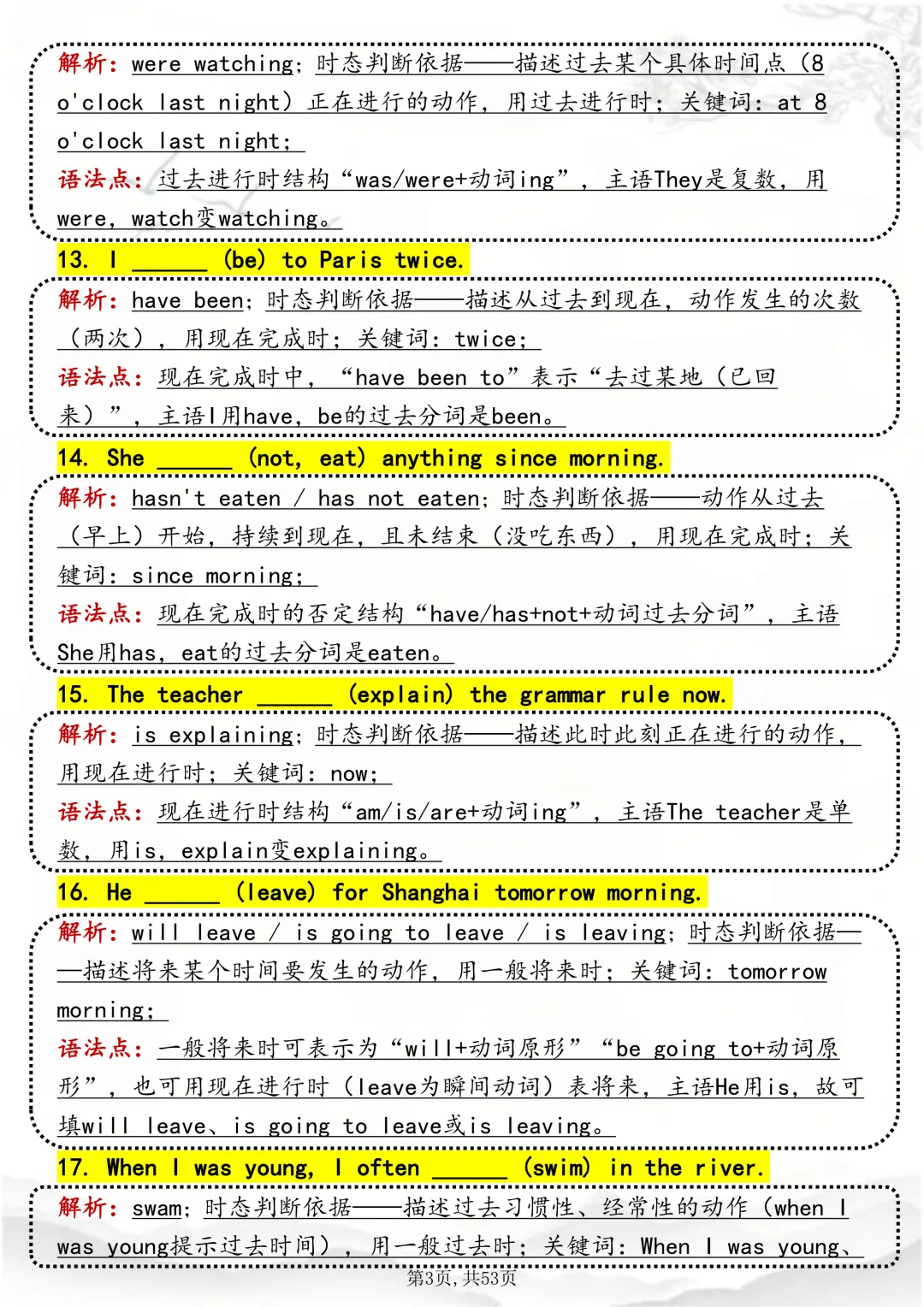 可打印,吃透英语“动词时态“,就靠这篇这篇文章啦!因篇幅有限,点击我的头像私信我回复“资料获取” 就可以领取 word 电子版。以下是部分资料内容,完整高清版的发送私信即可。本篇文章一共 53 页,完整版可打印↓↓↓
