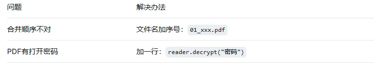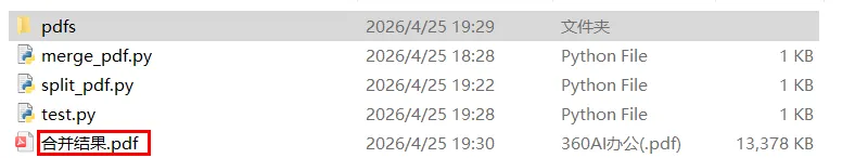 from pypdf import PdfWriter, PdfReaderfrom pathlib import Path# 存放所有PDF的文件夹folder_path = "pdfs"# 输出文件名output_file = "./合并结果.pdf"writer = PdfWriter()# 获取所有PDF文件,按文件名排序for pdf_path in sorted(Path(folder_path).glob("*.pdf")):reader = PdfReader(pdf_path)for page in reader.pages:writer.add_page(page)writer.write(output_file)writer.close()print(f"✅ 合并完成!共 {len(writer.pages)} 页 → {output_file}")