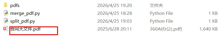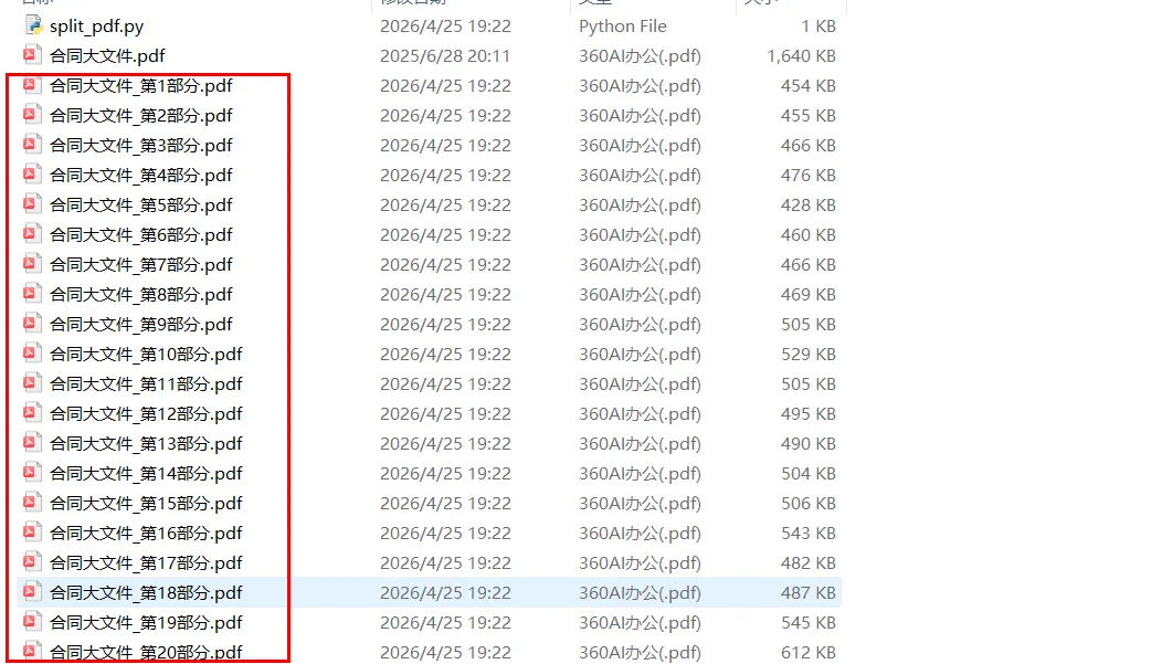 from pypdf import PdfReader, PdfWriterreader = PdfReader("./合同大文件.pdf")pages_per = 2 # 每个文件多少页for start in range(0, len(reader.pages), pages_per):writer = PdfWriter()end = min(start + pages_per, len(reader.pages))for num in range(start, end):writer.add_page(reader.pages[num])part = start // pages_per + 1writer.write(f"./合同大文件_第{part}部分.pdf")writer.close()print("拆分完成")