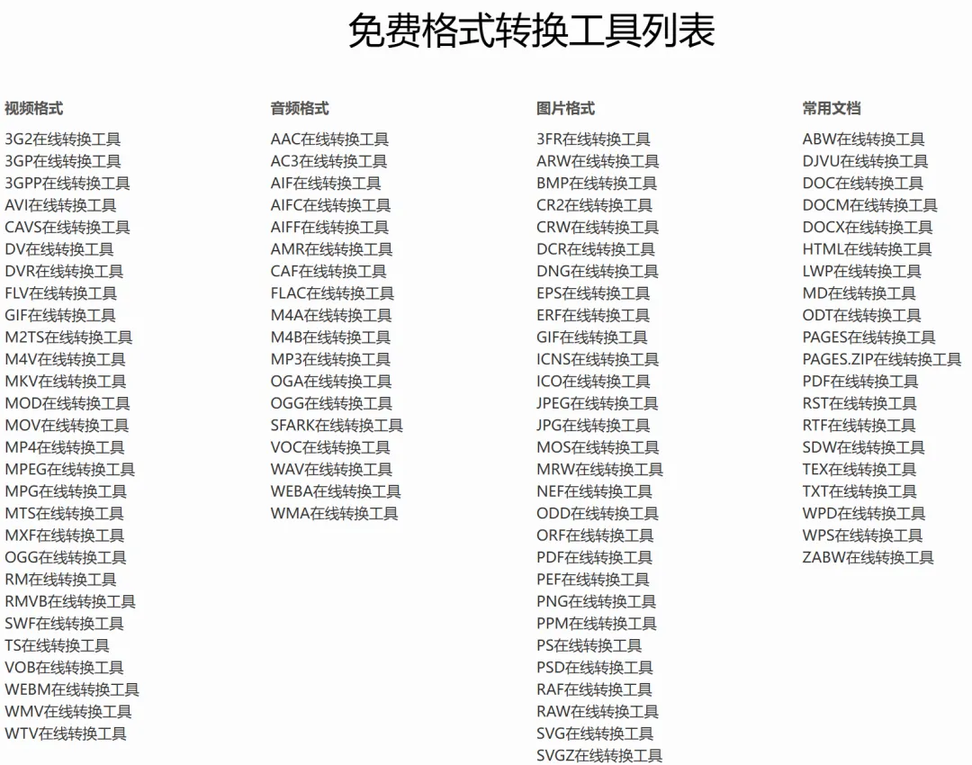 除了文档格式转换,网站还支持视频、音频、图片格式转换,另外还提供表格、电子书、压缩文件等的格式转换,可以说是很全能了,有了这个网站,确实可以解决我们工作中的很多需求,所以宝子们不要忘记收藏。