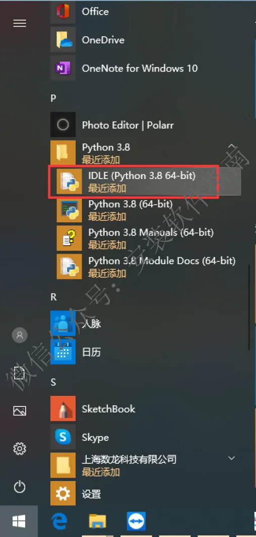 13、快捷方式图标不会自动出现在桌面,需要自己找出来。打开开始菜单,找到 IDLE (Python 3.8 64-bit),左键按住,拉到桌面即可。