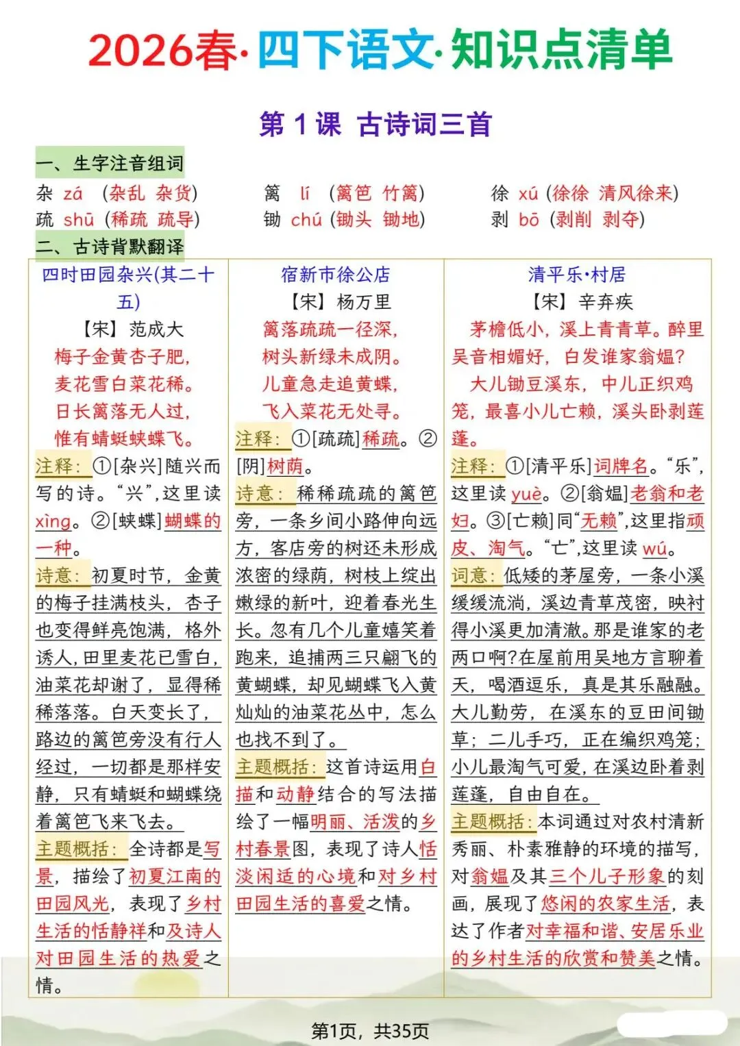 今天给大家分享的是:26春新版四年级下册语文《知识点清单》,PDF电子版,高清电子版可打印。