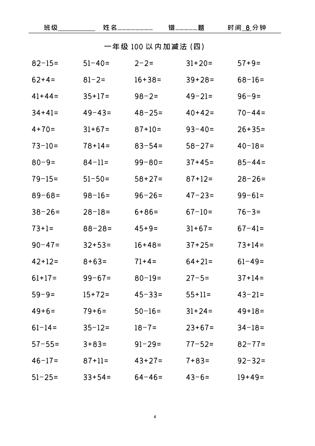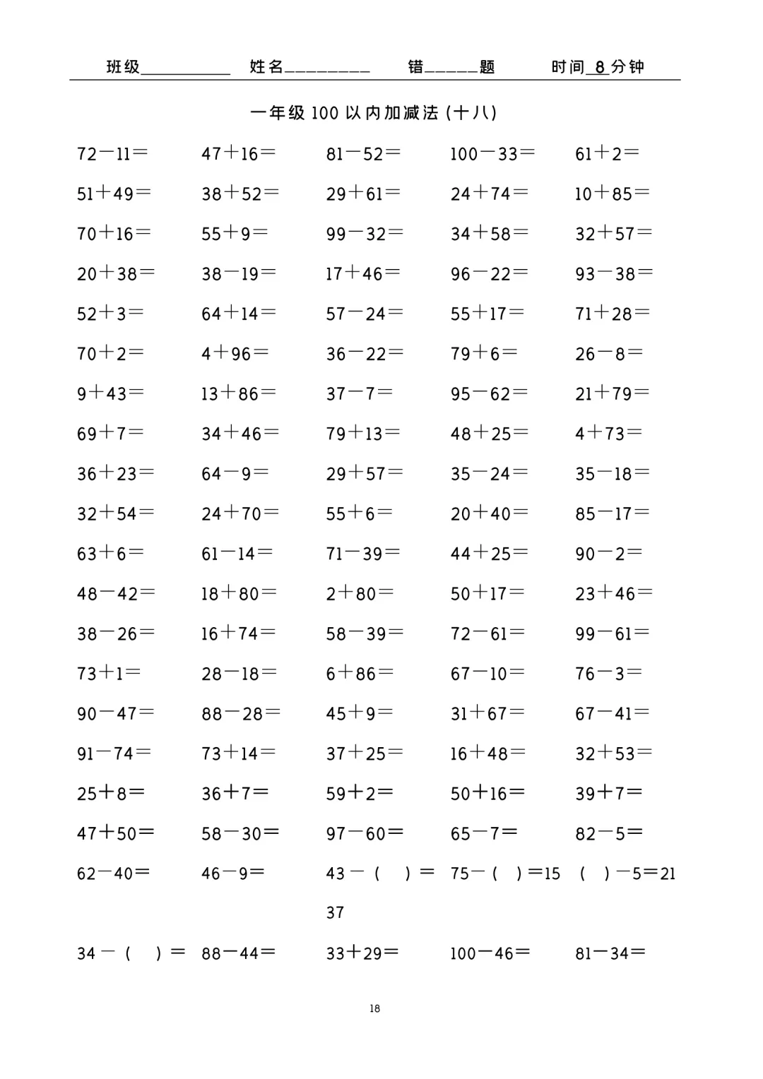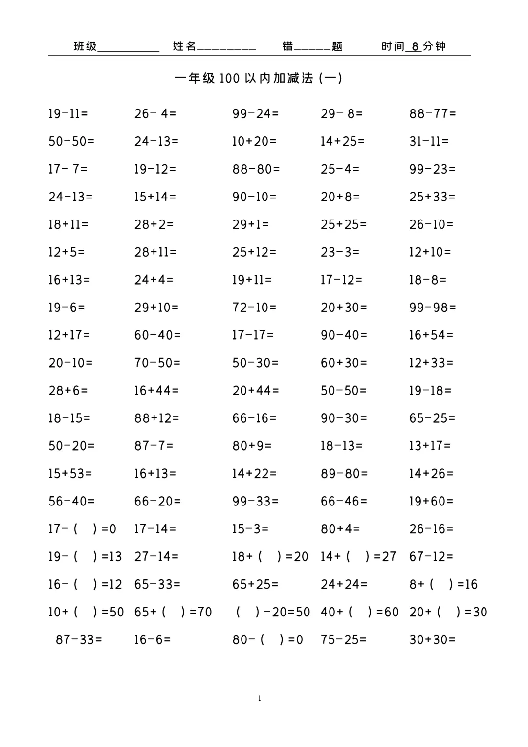 王老师整理了小学一年级下册数学《100以内加减法》口算题电子版可打印,每日一练~