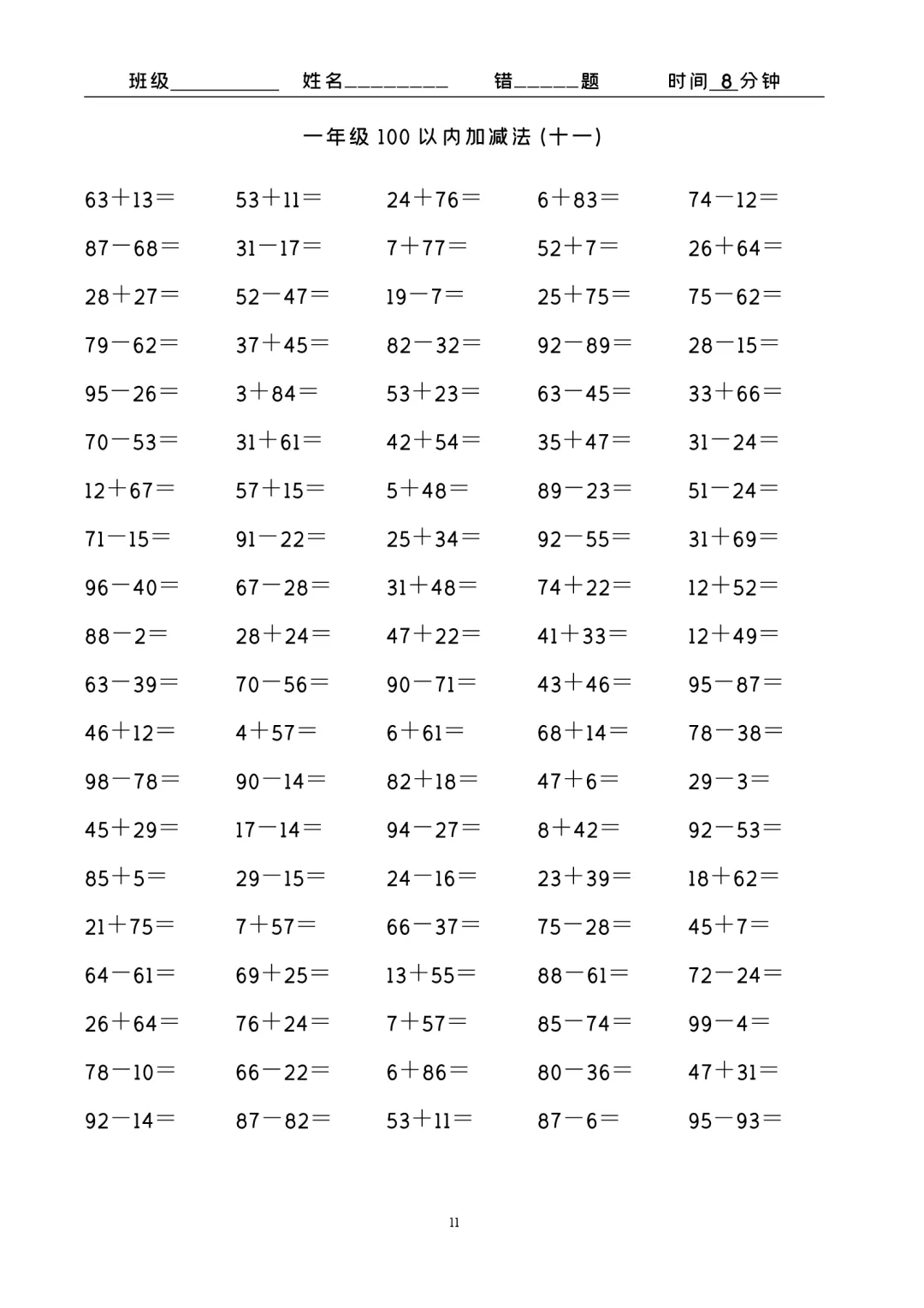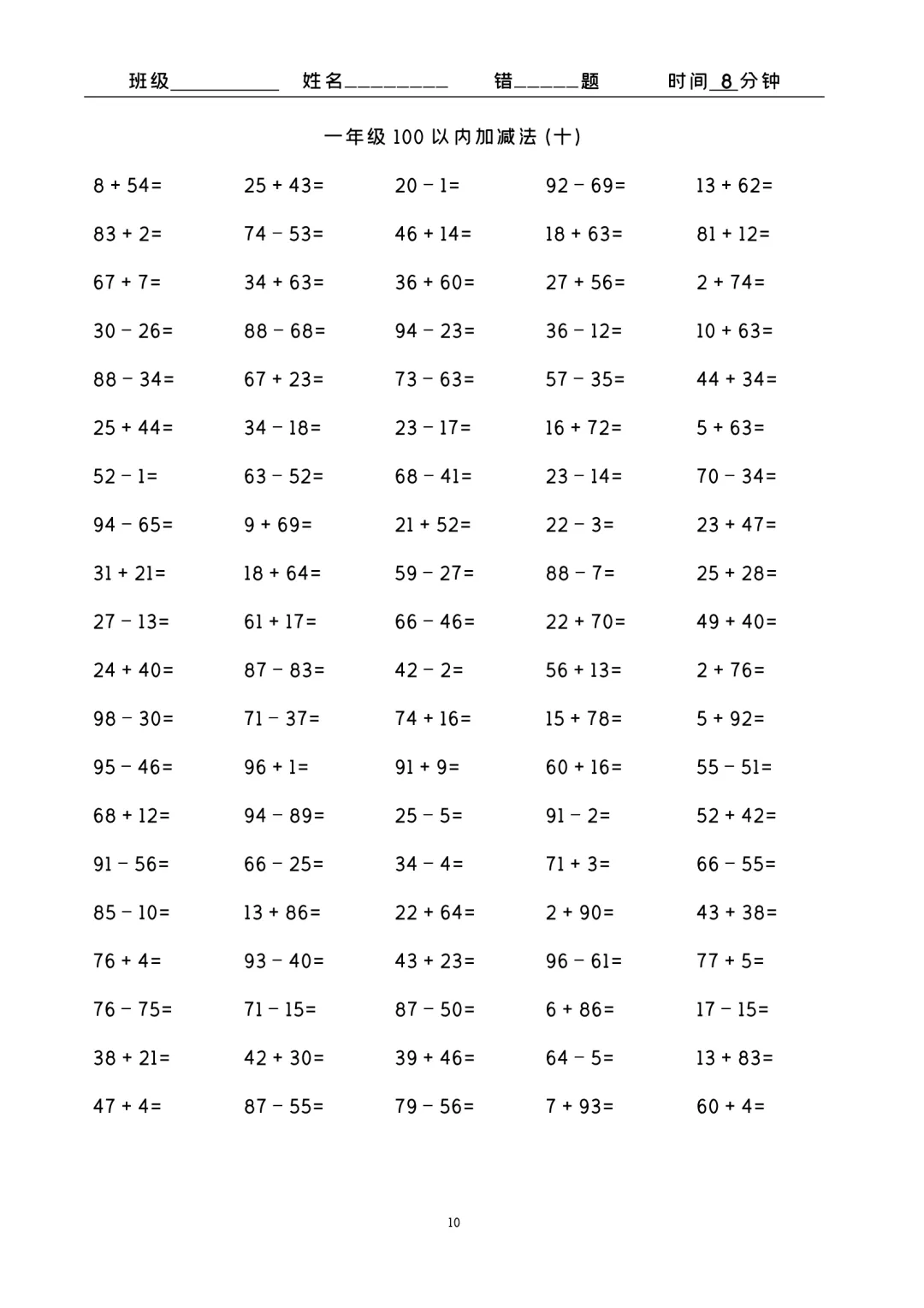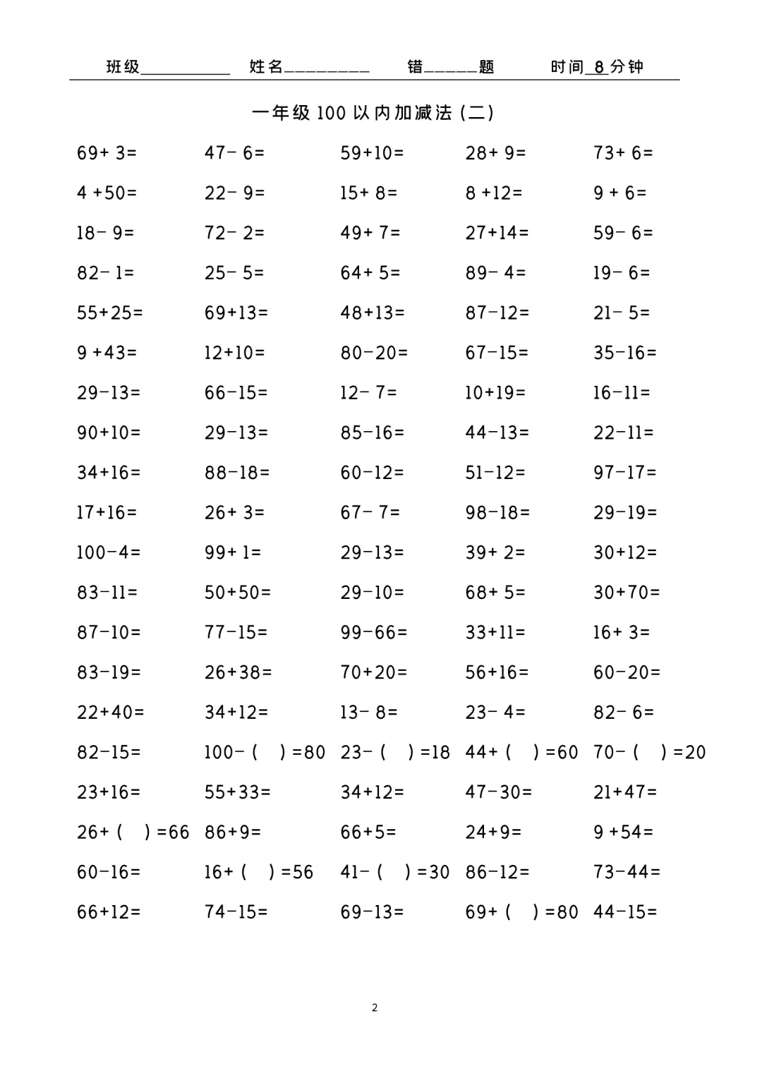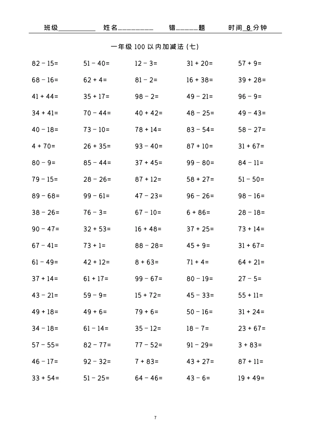 一年级下册数学《100以内加减法》口算题电子版可打印,每日一练~