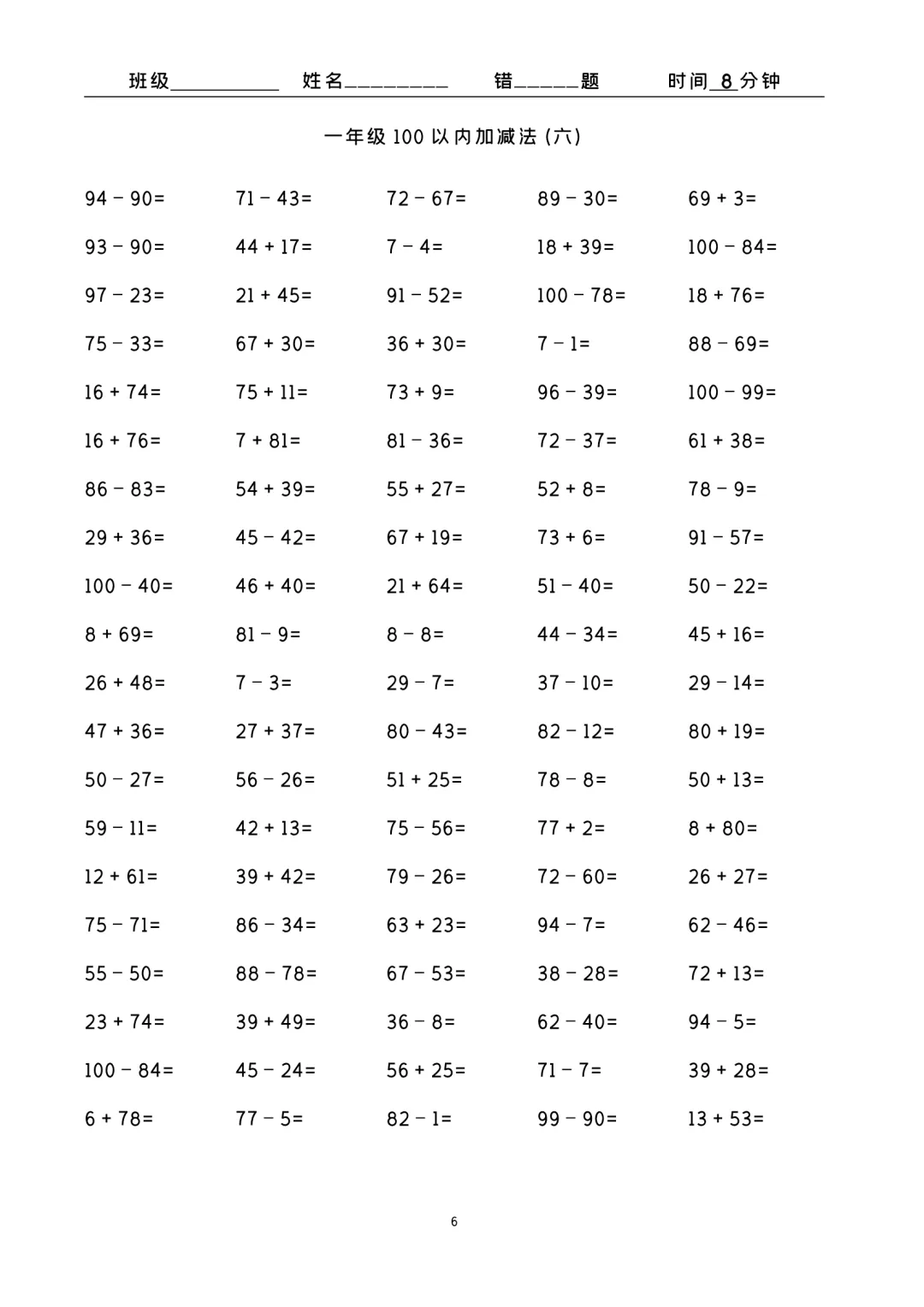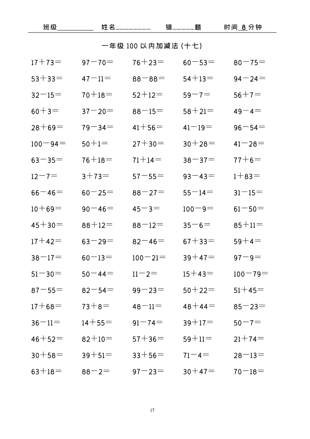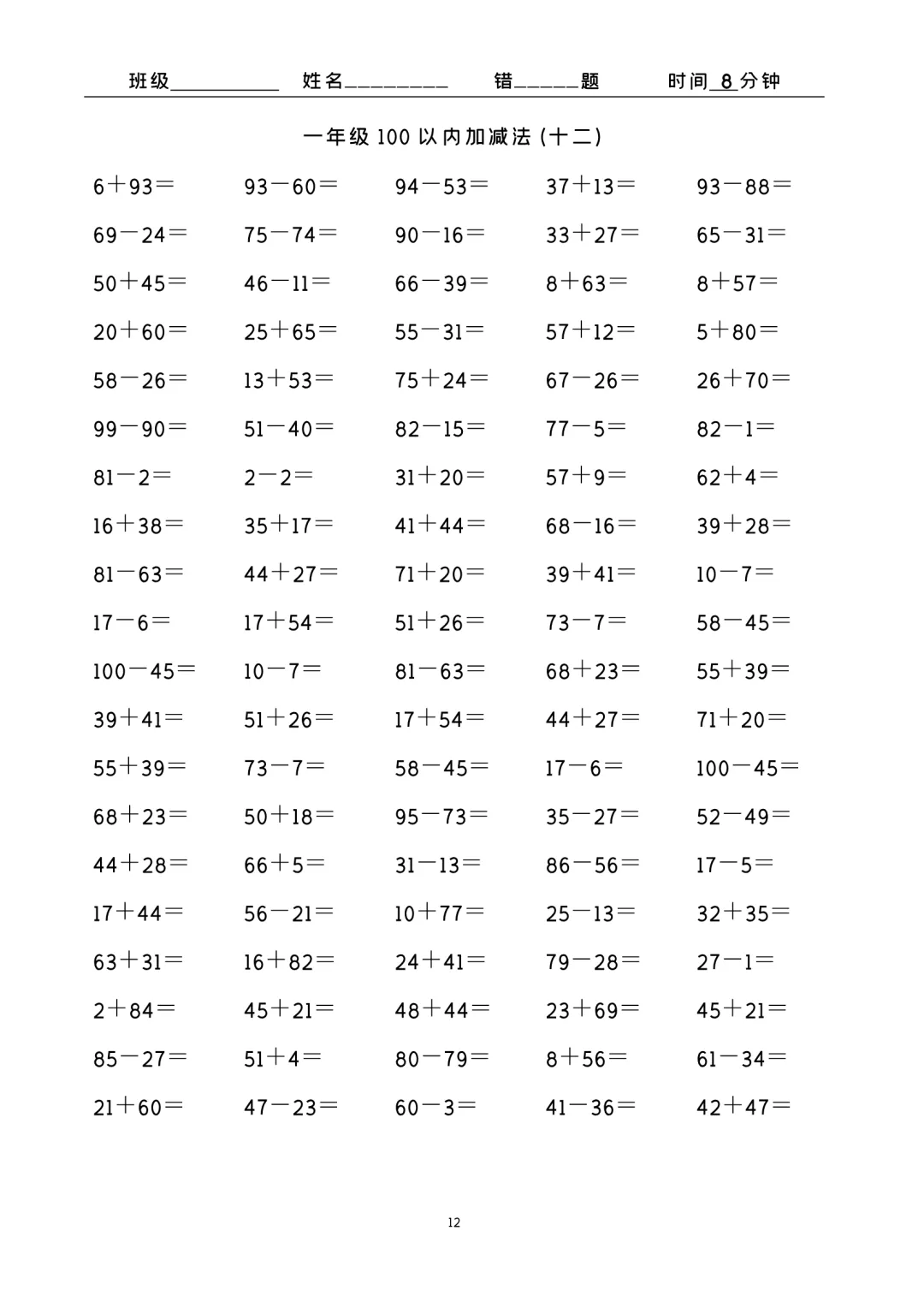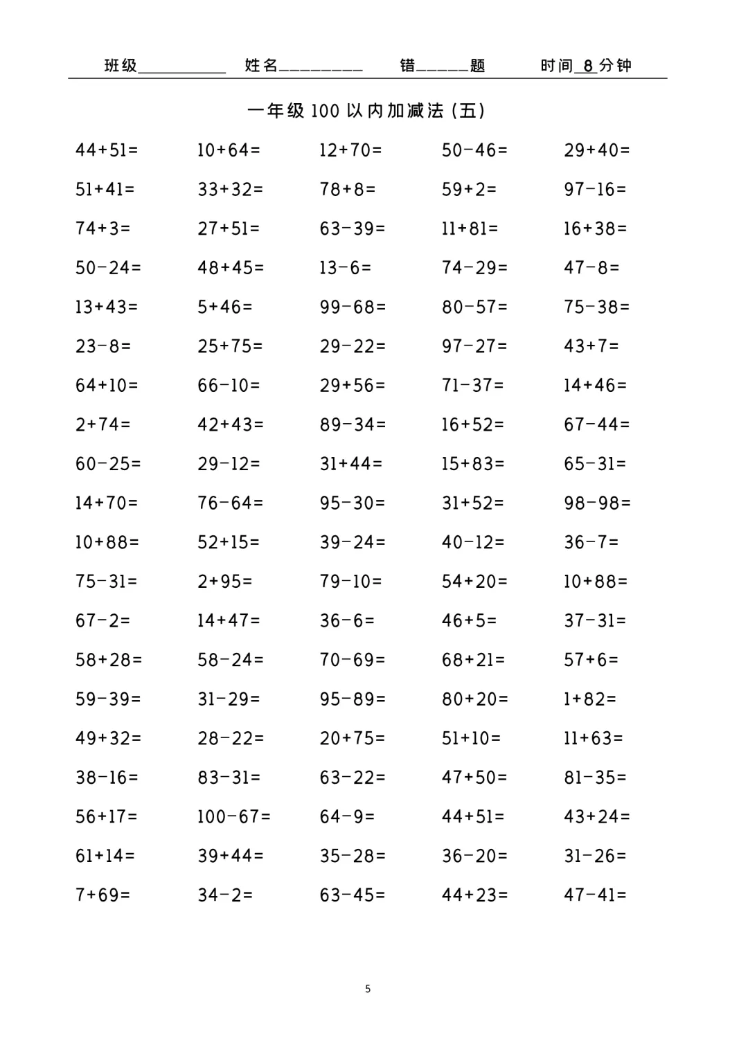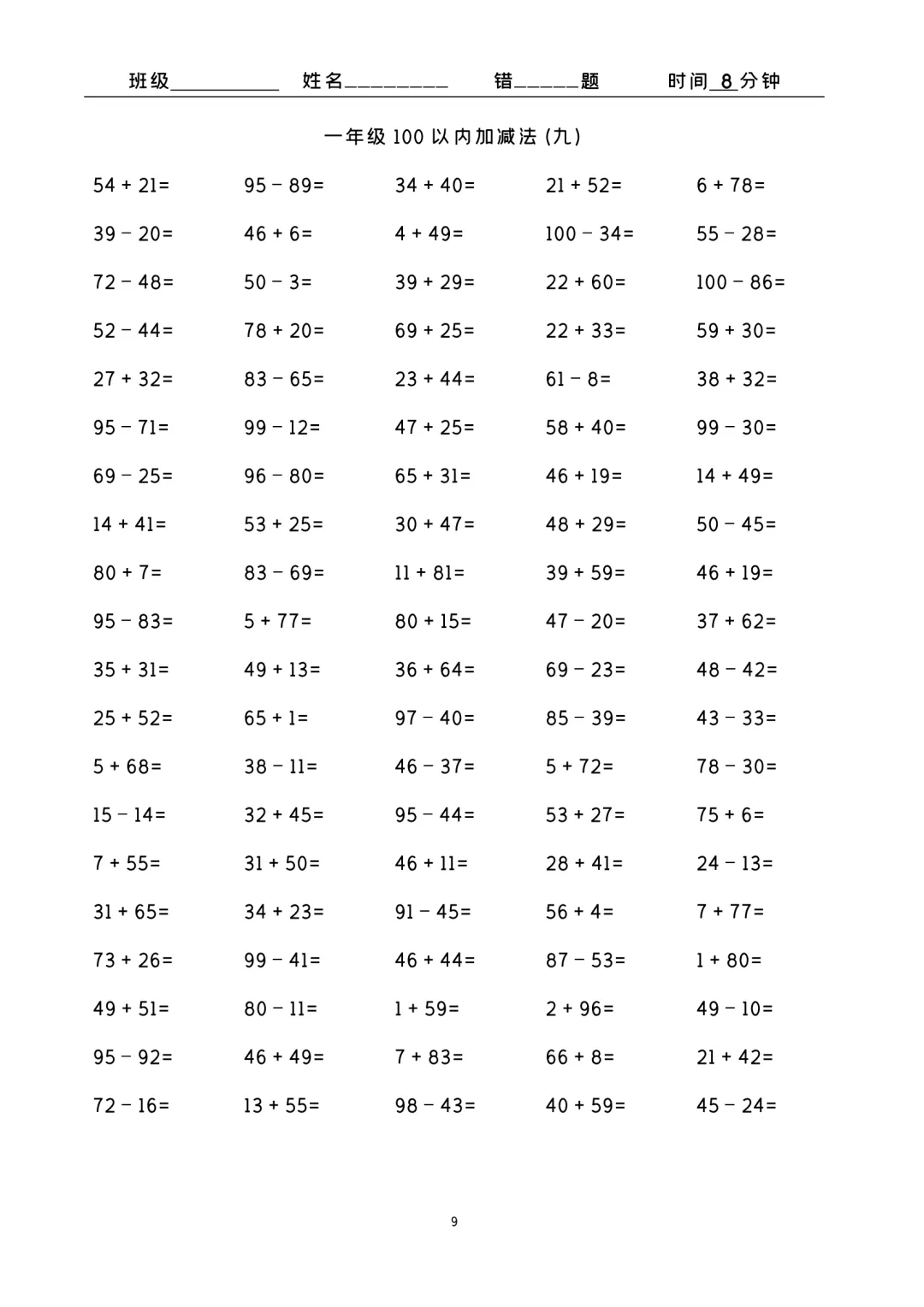 一年级下册数学《100以内加减法》口算题电子版可打印,每日一练~