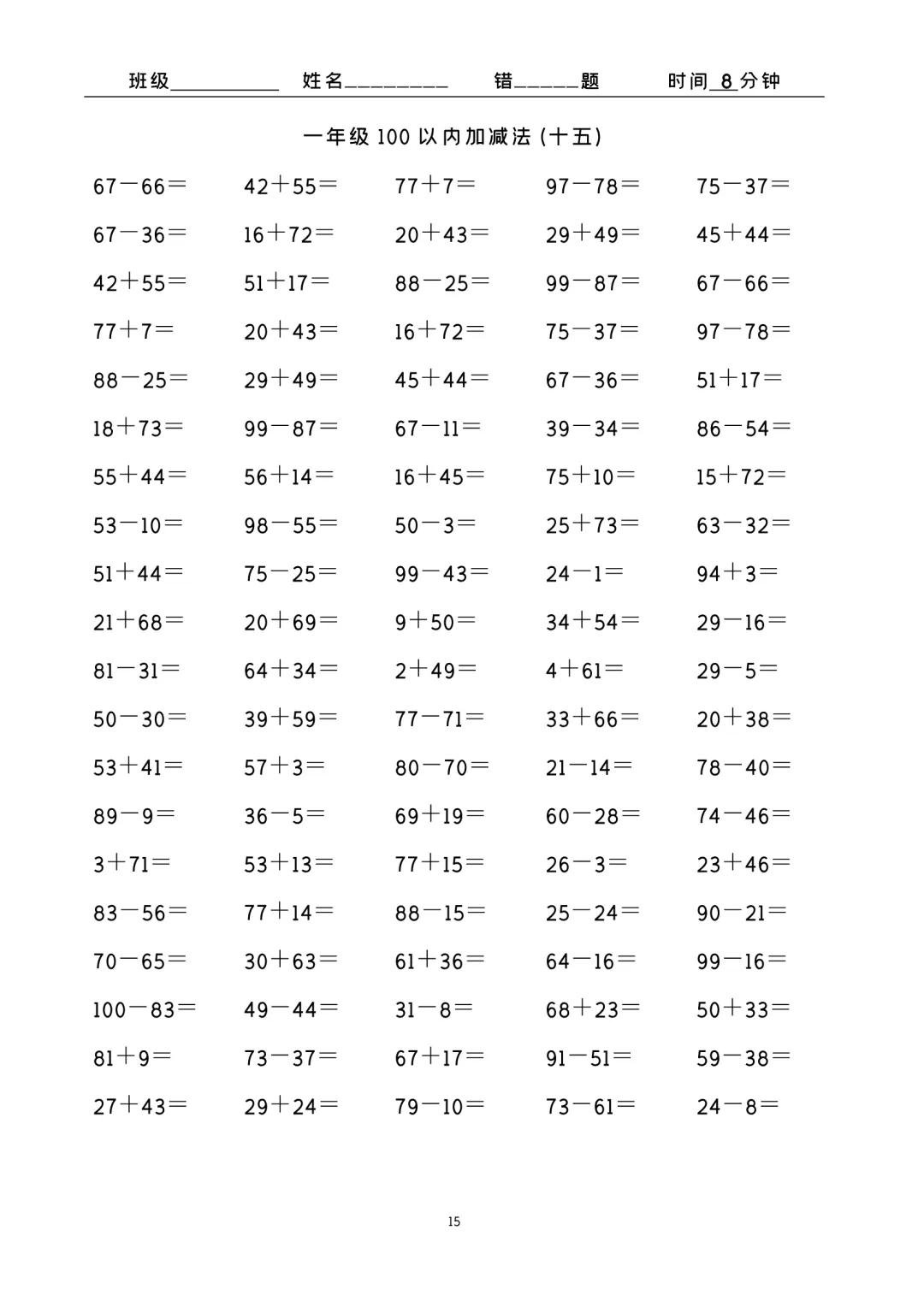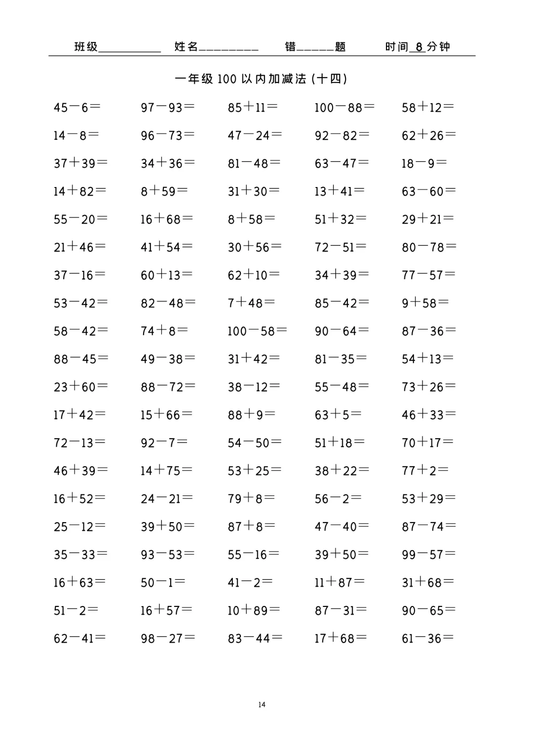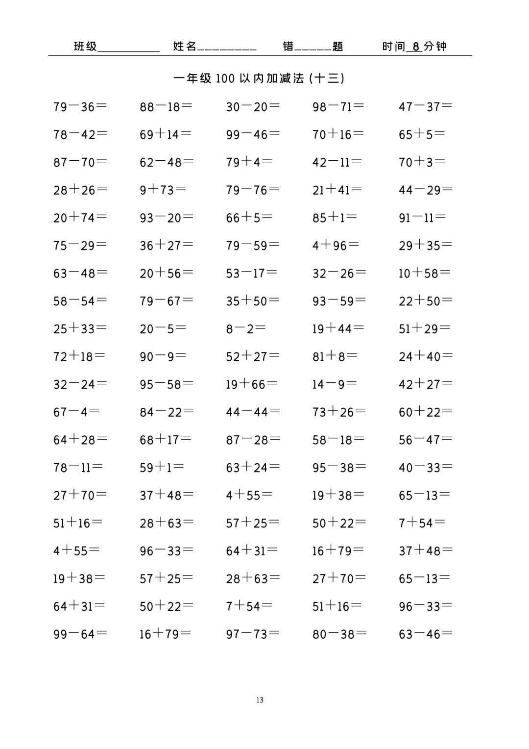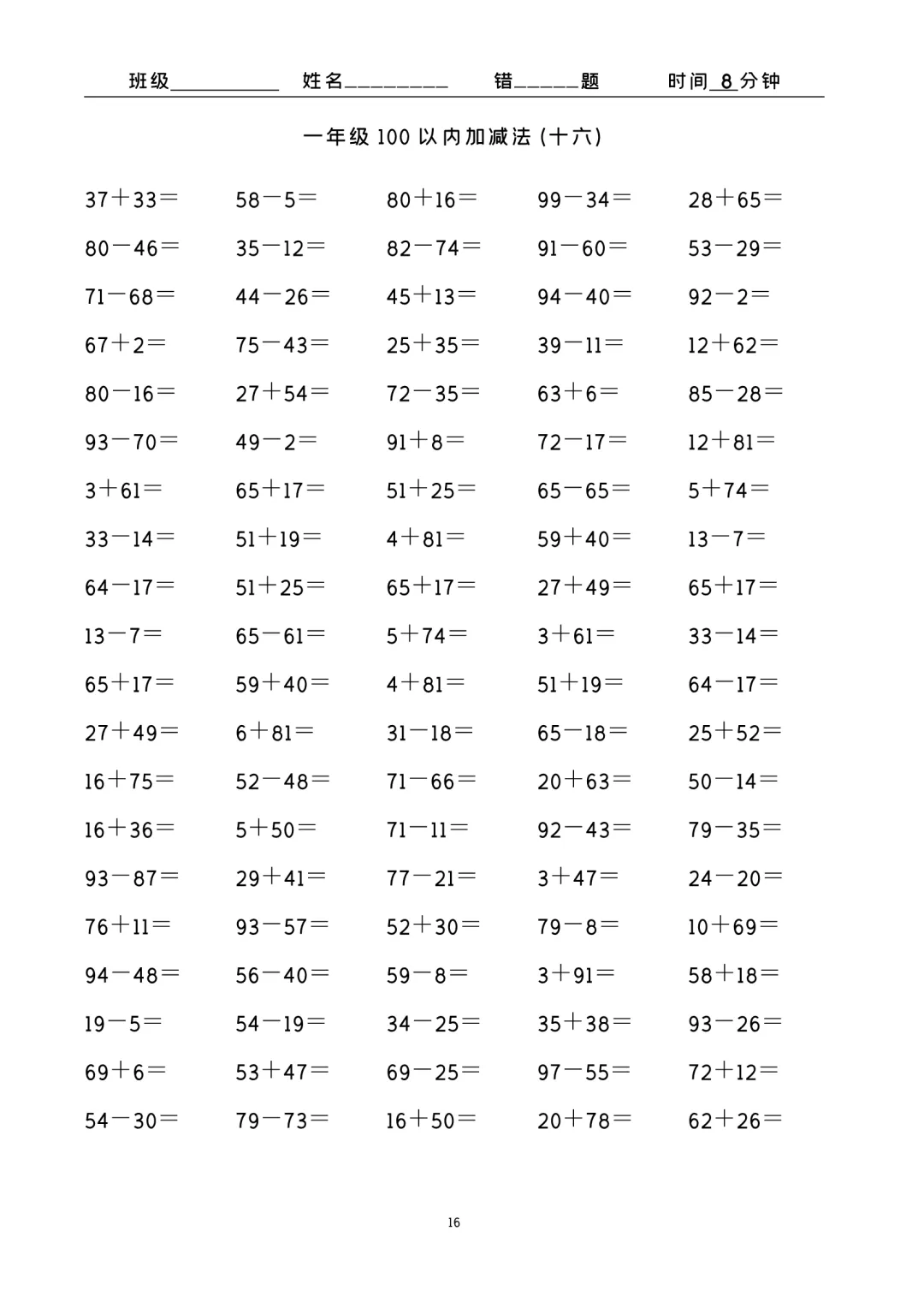 一年级下册数学《100以内加减法》口算题电子版可打印,每日一练~