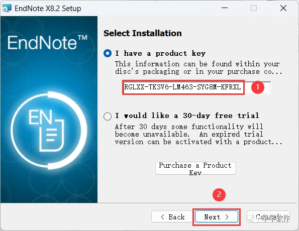 5、输入key:RGLXX-TK3V6-LM463-SYG8M-KFRXL,再点击【Next】