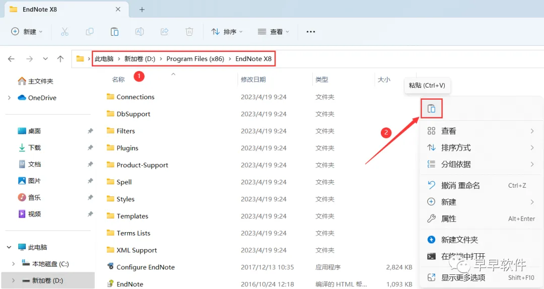 19、打开路径:D:\Program Files (x86)\ EndNote X8,再右键文件夹的空白处,点击【粘贴按钮】