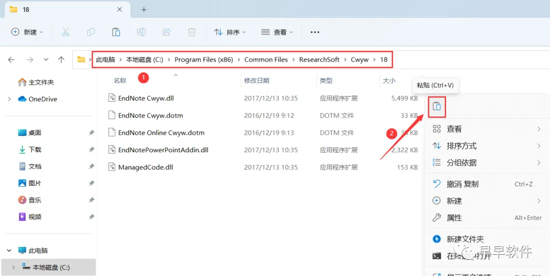 23、打开路径:C:\Program Files (x86)\Common Files\ ResearchSoft\Cwyw\18,再右键文件夹的空白处,点击【粘贴按钮】