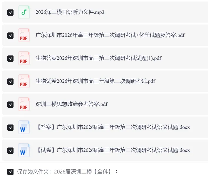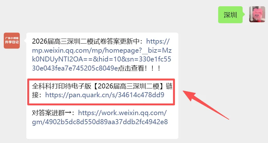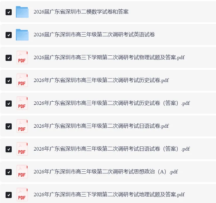 全科可打印!2026深圳二模试题+答案电子版下载!2026年深圳市高三年级第二次调研考试全科模考试卷+答案电子版,请在【广东小师姐升学日记】公众号后台私信“深圳”即可下载完整版文档~部分内容预览👇因文章展示篇幅有限全科模考试卷+答案完整版,请在【广东小师姐升学日记】公众号后台私信“深圳”即可获得完整版文档~广东高考大数据各校分数线、院校介绍、专业选科要求扫码即可进入↓↓