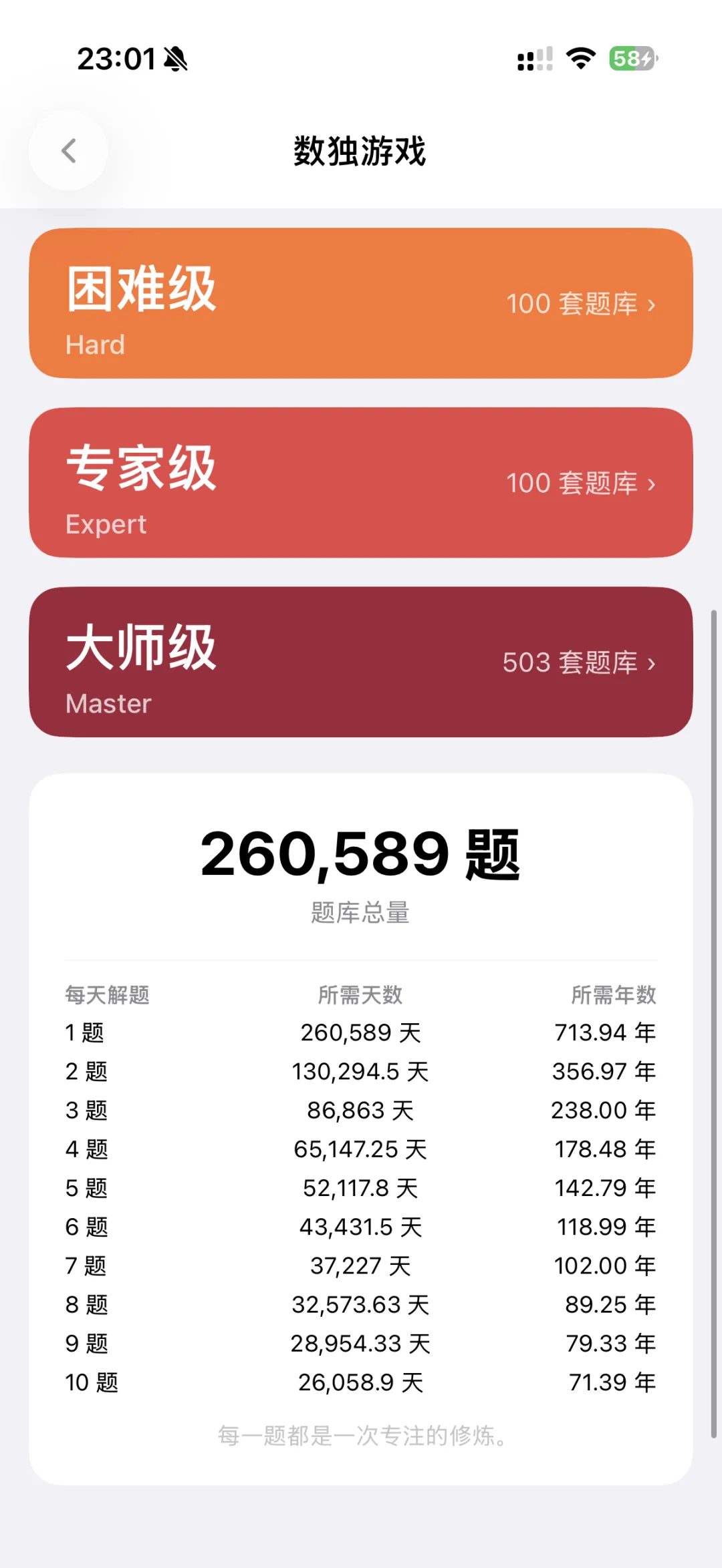 题库多达:260589 题,每天 1 题,可以玩 713.94 年。