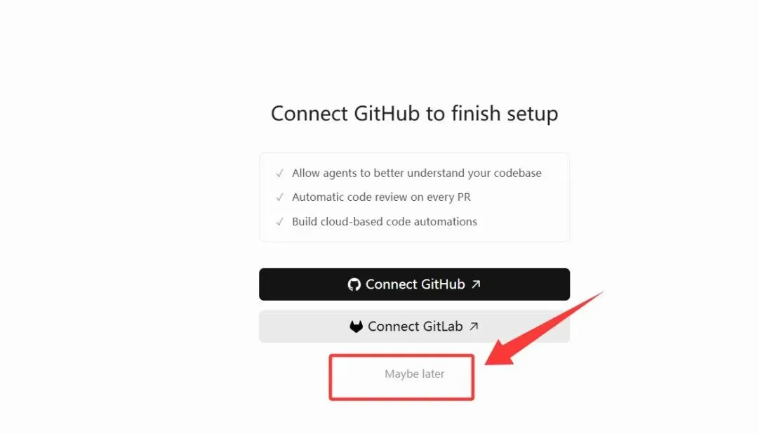 Continue后,出现以下界面,此界面主要是问你是否连接你的GitHub账号(推荐),但个人建议选择Maybe later稍后再说,也就是路过账号连接,直接使用基础功能;