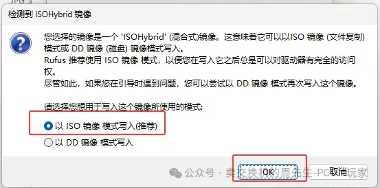 选择“以ISO镜像模式写入(默认)”,点击"ok"开始烧录,再出现弹窗直接确定/选下一步就是了