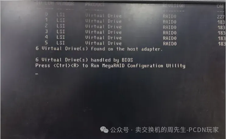 出现该界面后,键盘输入Ctrl+R,进行RAID 0设置。(建议一直按,如果错过,需要重启服务器,再重复以上操作。重启指令为Ctrl+Alt+Delete)
