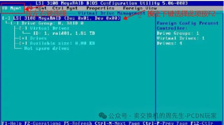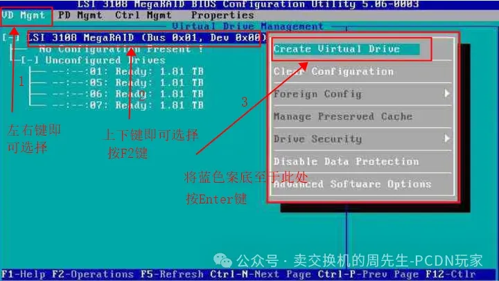 然后见此图按左右键键将蓝色案底至于VD Mgmt处,上下键选择第一行,然后再按F2会出现次页面,然后创建RAID虚拟设备