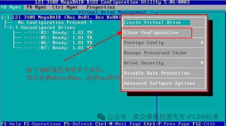 按F2后会出现这个界面,然后选择 Clear Configuration清除之前的配置及数据,按 Enter 键选择 yes 即可清除