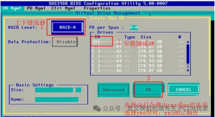 RAID Level选择 RAID-0(默认选项,不用选择),直接按下键选择需要做 raid 的磁盘,每次只选择一块磁盘进行 raid0,每块盘都需要操作。