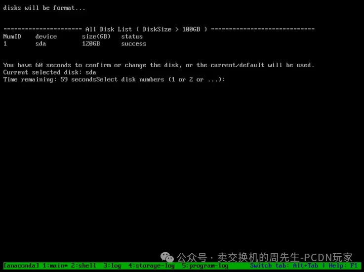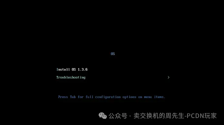 启动后会出现install的安装界面,回车进行装系统(系统盘空间需>100g,且非移动硬盘),如硬盘选择超时未手动选择,系统会自动选择空间大于100g的最小可用硬盘进行安装。