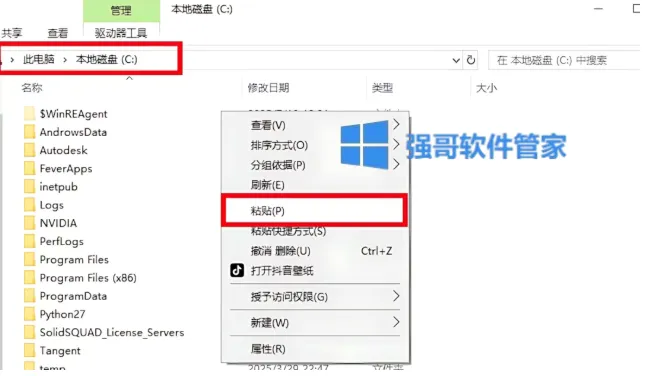 3.打开电脑C盘,鼠标右击空白处选择【粘贴】