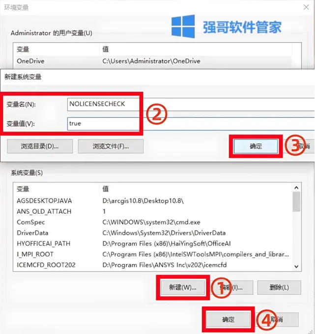 10.创建环境变量:①点击系统变量下的【新建】②输入变量名【NOLICENSECHECK】和变量值【true】③点击【确定】④点击【确定】。