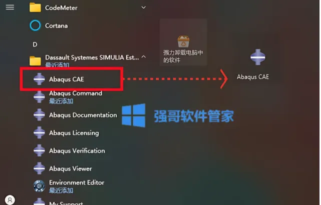 50.创建桌面启动快捷方式:❶点击桌面左下角【开始】图标,❷点击【Dassault……】文件夹→拖动【Abaqus CAE】图标到电脑桌面
