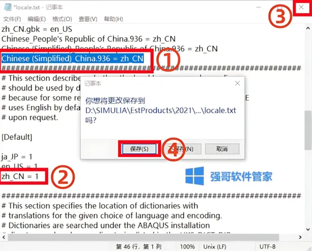 4.在第二行“########……”前加上【Chinese (Simplified)_China.936 = zh_CN】,在第三行“########……”前,将【zh_CN = 0】改为【zh_CN = 1】,修改完成后保存