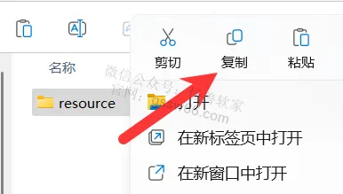 15,选中“resource”文件夹,点击鼠标右键,点击“复制”,或者使用快捷键“Ctrl”+“C”复制