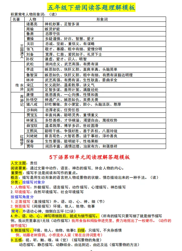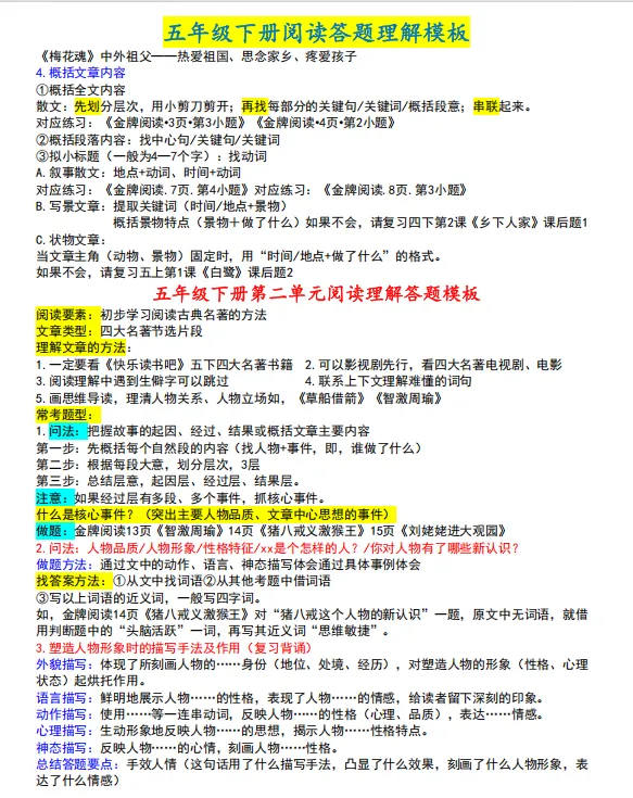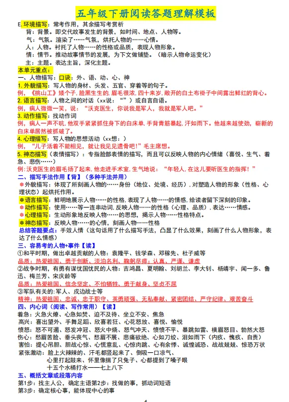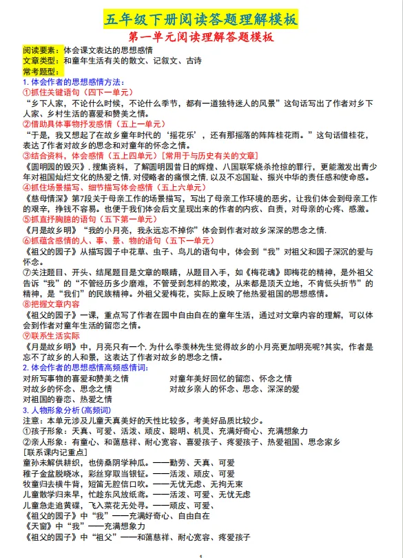 五年级下册语文《阅读理解答题模板》,电子版可打印可下载,这份五下语文阅读理解专项资料,包含了体会思想感情、人物形象分析、概括内容、描写手法赏析、动静结合、风趣语言体会等全单元答题模板与方法技巧,帮助孩子掌握阅读解题思路,套用模板轻松拿分,快速提升阅读理解能力。需要的家长抓紧打印出来,让孩子练一练吧!