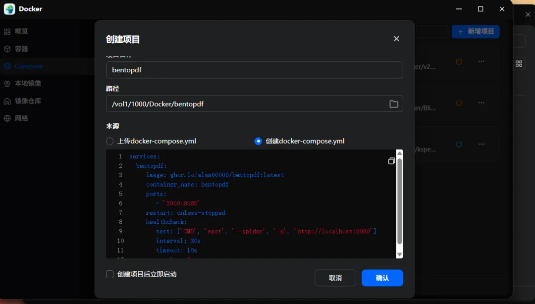 services:bentopdf:image: ghcr.io/alam00000/bentopdf:latestcontainer_name: bentopdfports:- '3000:8080'restart: unless-stoppedhealthcheck:test: ['CMD', 'wget', '--spider', '-q', 'http://localhost:8080']interval: 30stimeout: 10sretries: 3