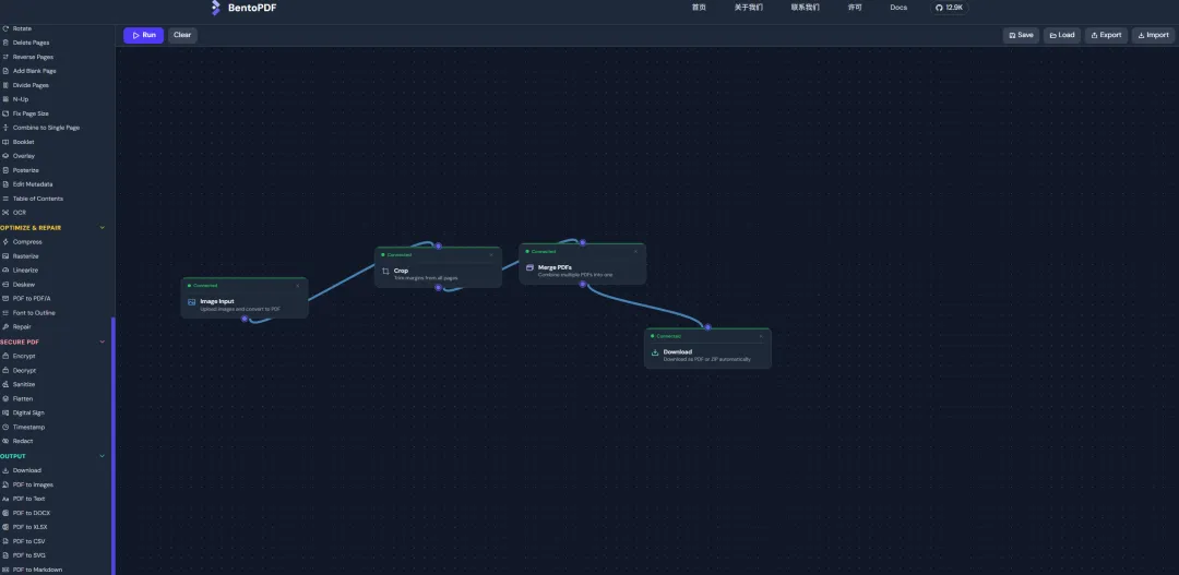 基础操作:合并、分割、旋转、删除、提取页面,支持批量处理。 格式转换: 转 PDF:支持 JPG, PNG, WebP, SVG, Word, Excel, PowerPoint, EPUB, Markdown 等数十种格式。 从 PDF 转:转为图片、Word、Excel、CSV、Markdown,甚至专为 AI 准备的 LlamaIndex JSON 格式。 编辑与注释:添加水印、页眉页脚、签名、印章,支持高亮、涂黑、注释。 高级处理: OCR:让扫描件可搜索、可复制。 压缩:减小文件体积。 PDF/A:转换为长期存档格式。 数字签名:支持 X.509 证书签名,私钥不离浏览器。 工作流构建器:通过可视化节点编辑器,自定义复杂的 PDF 处理流水线(比如:合并 -> OCR -> 压缩 -> 加水印)。