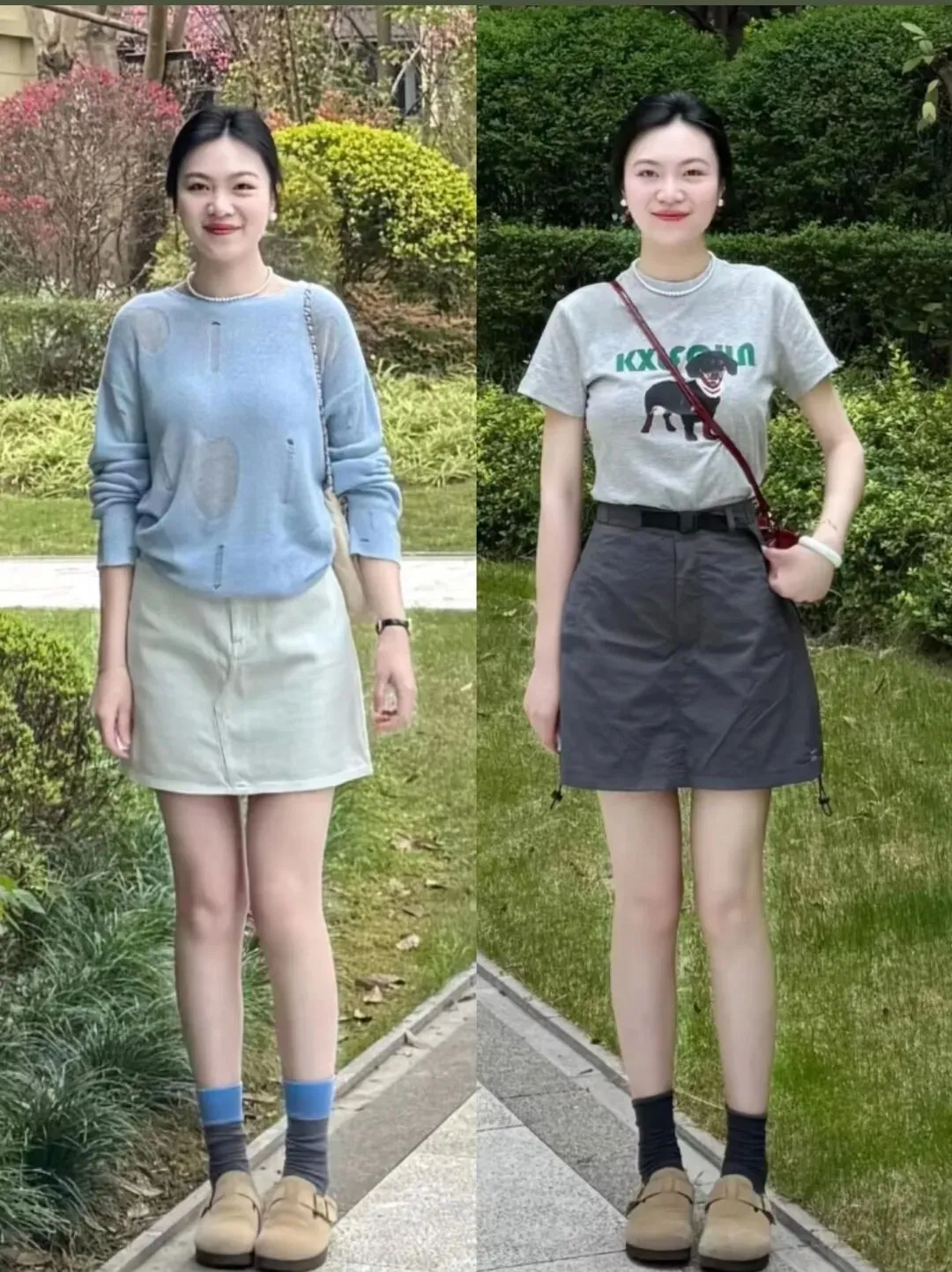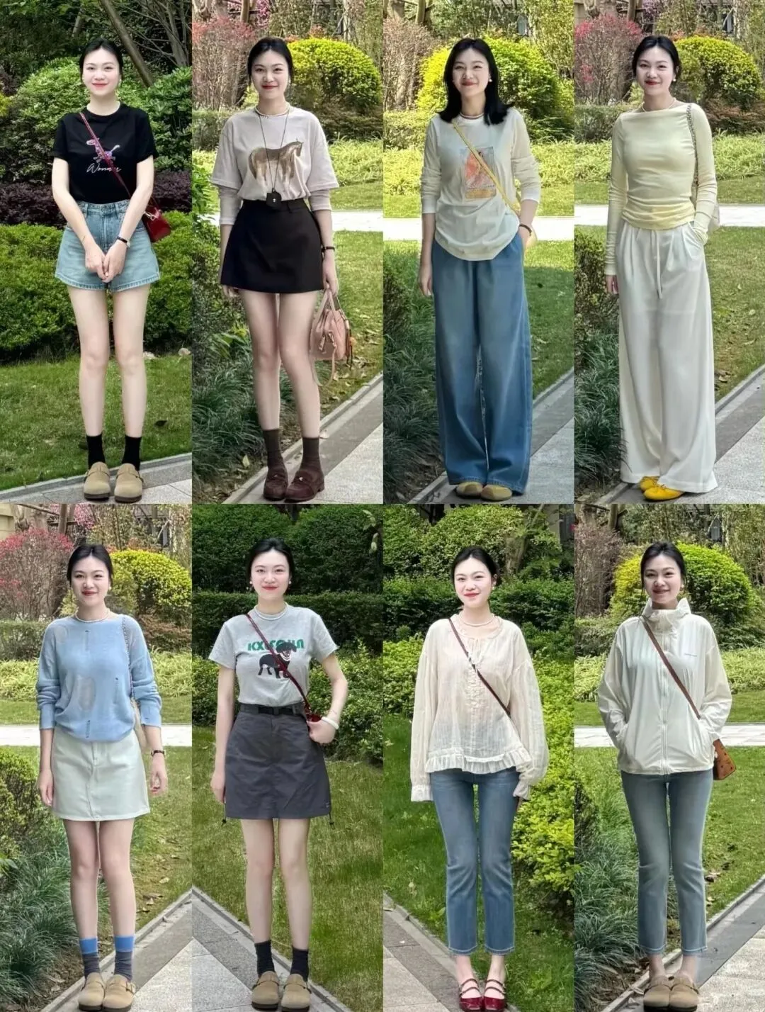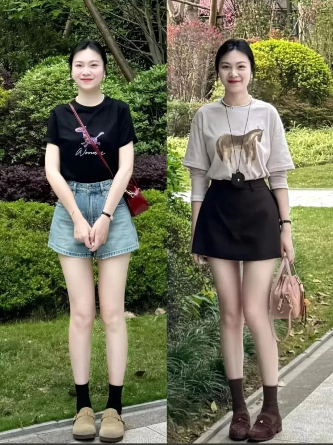 1. 甜酷休闲风|T恤+牛仔/短裙,春日元气首选- 黑色印花T恤+浅蓝牛仔短裤:经典黑白配色清爽不挑人,短裤露出修长腿线,搭配黑色中筒袜与浅棕色单鞋,甜酷平衡,日常出街清爽又元气;- 浅灰印花T恤+黑色短裙:弱化色彩攻击性,温柔感拉满,搭配棕红色中筒袜与复古单鞋,甜妹氛围拉满,短途出游、逛市集超合适。核心秘诀:T恤选宽松不紧绷款,短裙/短裤聚焦高腰设计,轻松优化比例,小个子也能穿出灵动比例。